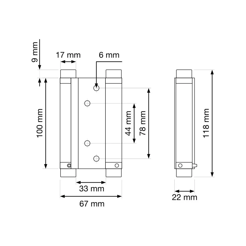 Kétoldalas nikkelezett pánt bárajtókhoz, 100 mm szélességgel, amely nyitás után visszaáll eredeti állapotába. Bárajtókhoz, konyhaajtókhoz stb. használható. 18-26 mm vastagságú szekrényekhez alkalmas.
