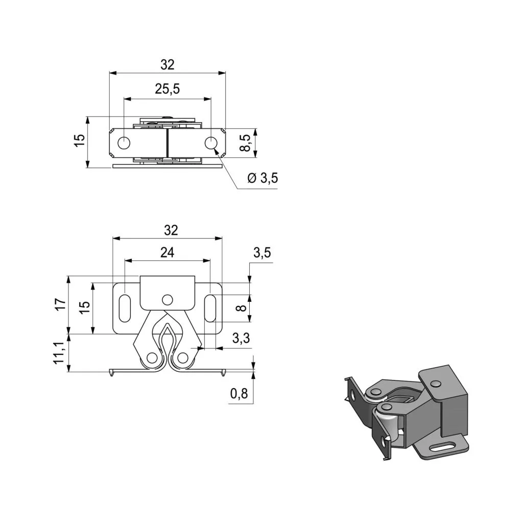 32 mm magas acél retesz dupla görgős reteszeléssel. A csavarozható retesz tartalma: egy 15 mm széles talp, 24 mm-es lyuktávolság és egy ellendarab. Alkalmas ajtók kinyílás elleni biztosítására. A csomag 2 darabot tartalmaz.