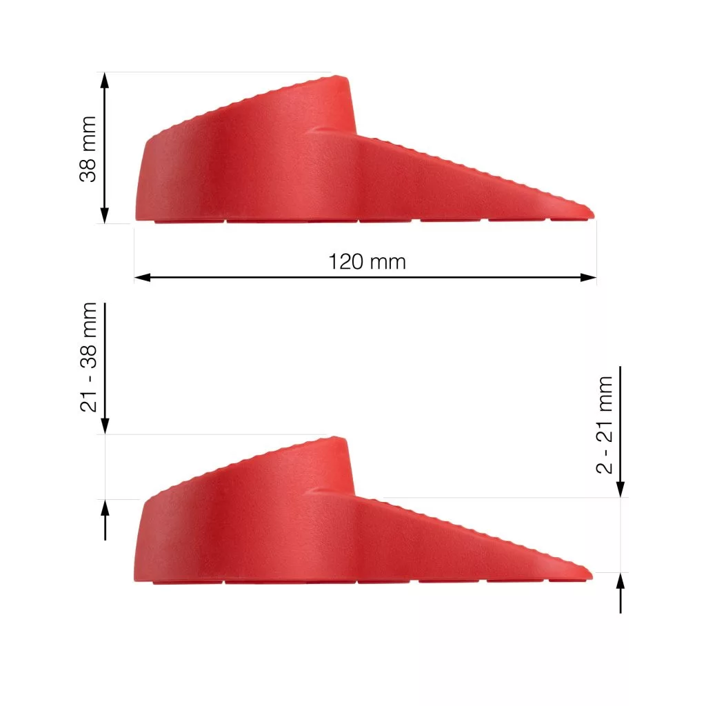 Többcélú ajtó- és ablakütköző piros színben, 120 mm széles és 21-38 mm/2-21 mm magas. Erős huzat esetén is rögzíti az ablakokat, ajtókat és erkélyajtókat. A zár beltéren és kültéren is használható, bármilyen felületen tart.