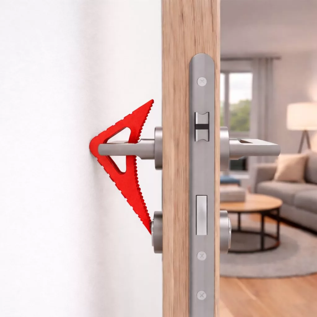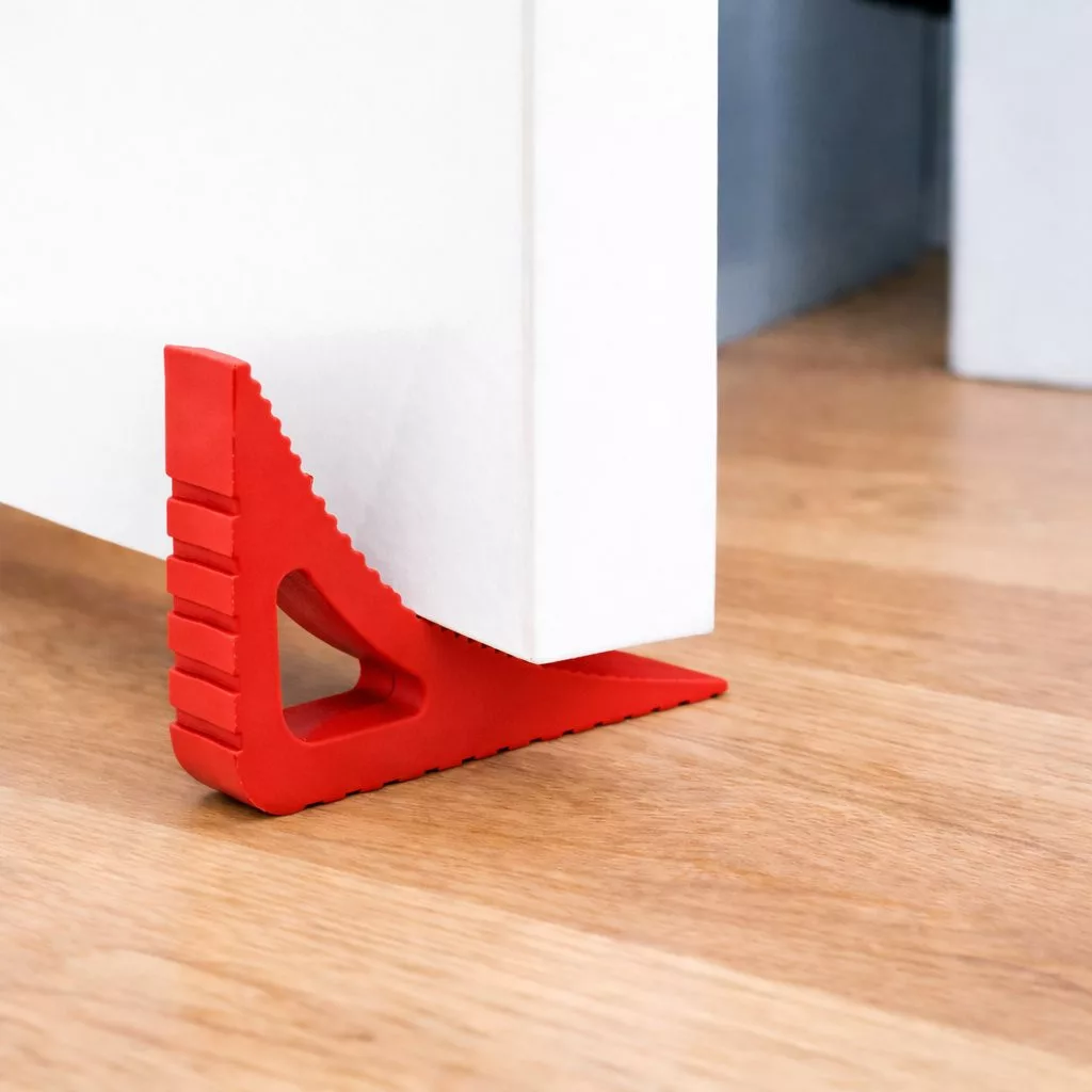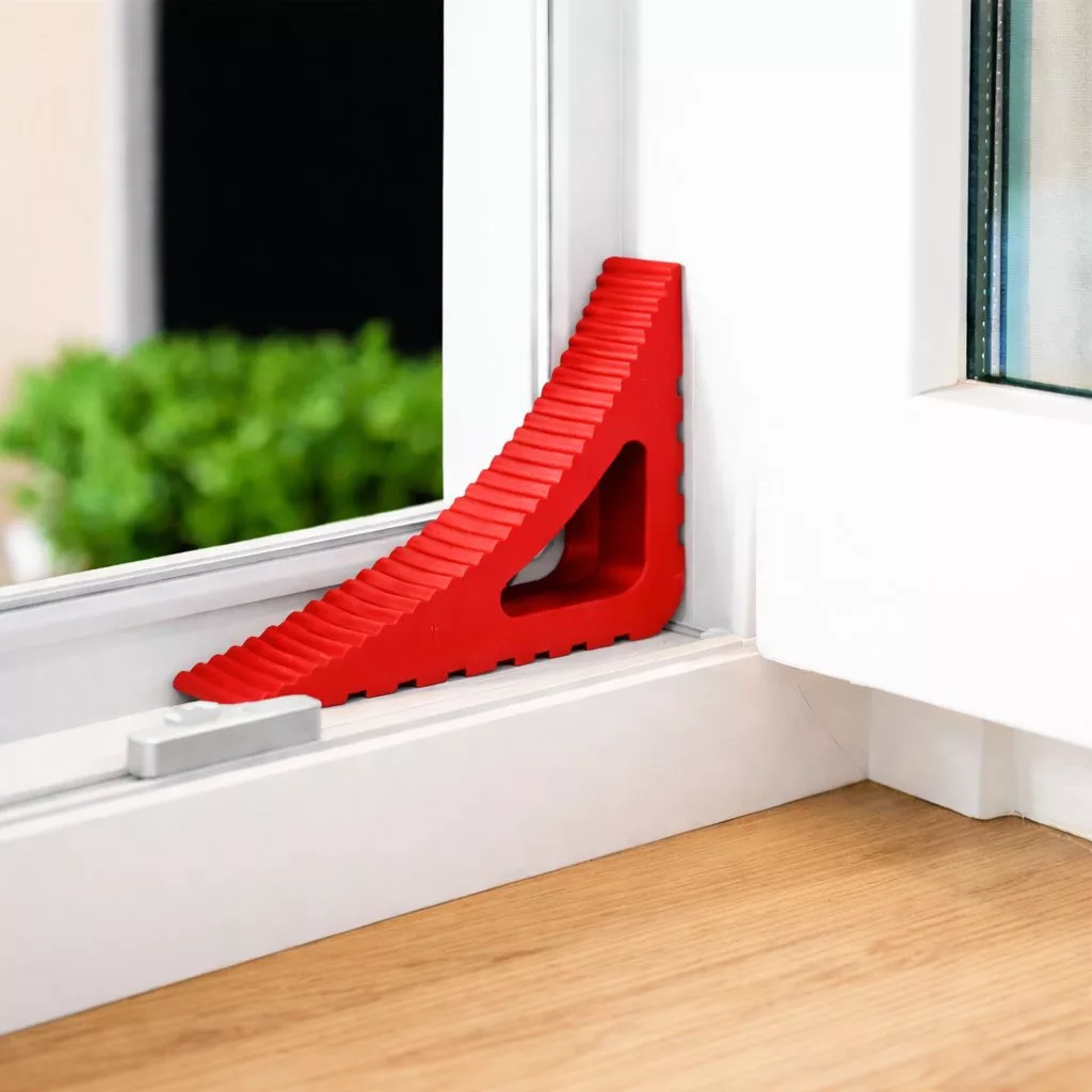 BLOCKYSTAR többcélú ajtó- és ablakütköző piros színben, 80 mm széles és 117 mm magas. Erős huzat esetén is rögzíti az ablakokat, ajtókat és erkélyajtókat. A kilincsre is rögzíthető, így megakadályozza a fal karcolódását. Az ütköző beltéren és kültéren is használható, bármilyen felületen tart.