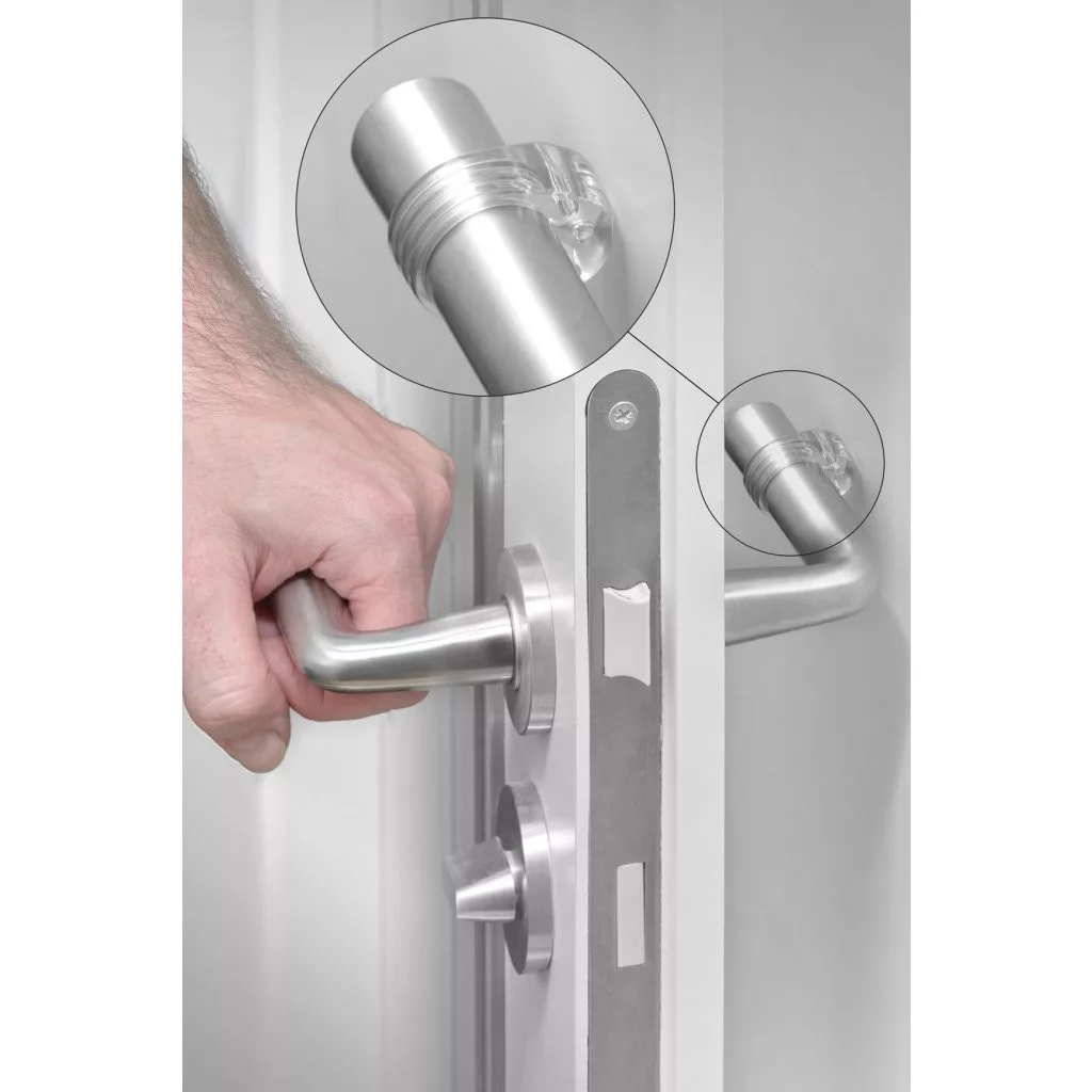 Átlátszó kilincsütköző 15 mm belső átmérővel. Rugalmasságának köszönhetően 20 mm-ig állítható. Megvédi a falakat és a bútorokat az ajtó- és ablakkilincsek ütéseitől. A ütköző ovális és kerek fogantyúkra is rögzíthető.