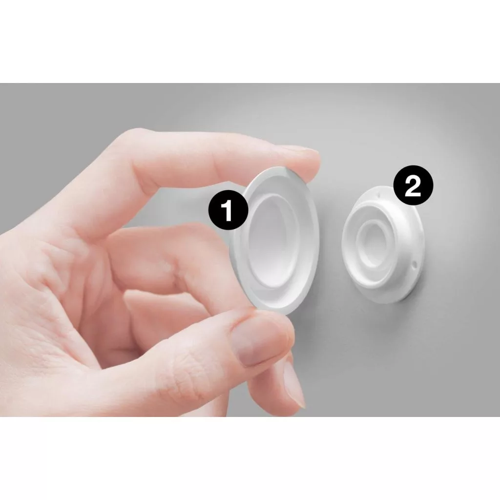 40 mm átmérőjű és 10 mm magas, fehér színű műanyag ajtóütköző. A fogantyú magasságában falra ragasztható. Védi a falat az ütésektől.