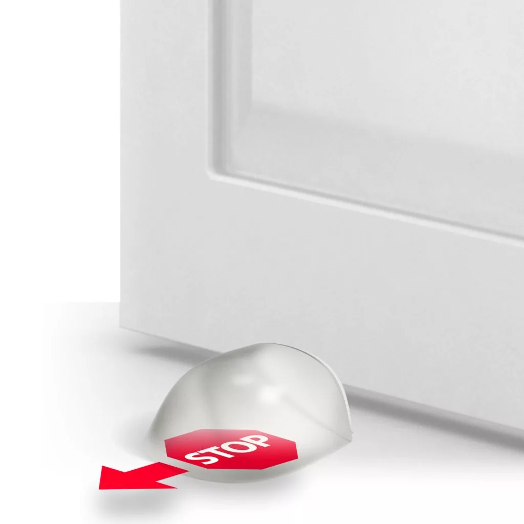 Átlátszó ajtóütköző 42 mm szélességgel, 36 mm mélységgel és 22 mm magassággal. Védi a falakat és a bútorokat az ajtó ütődéseitől. Minden típusú sima padlóra ragasztható.