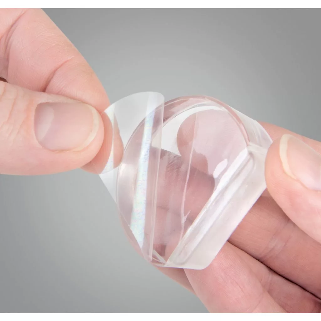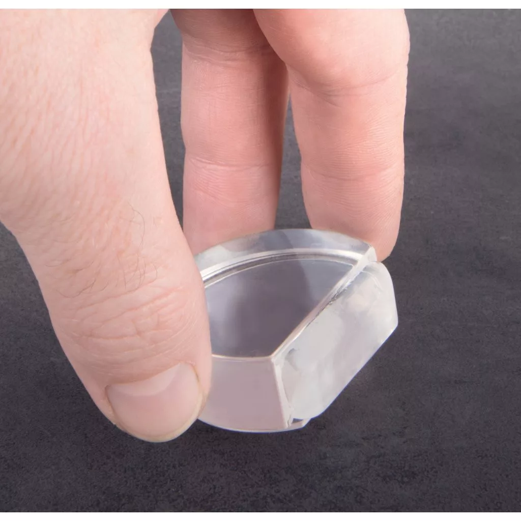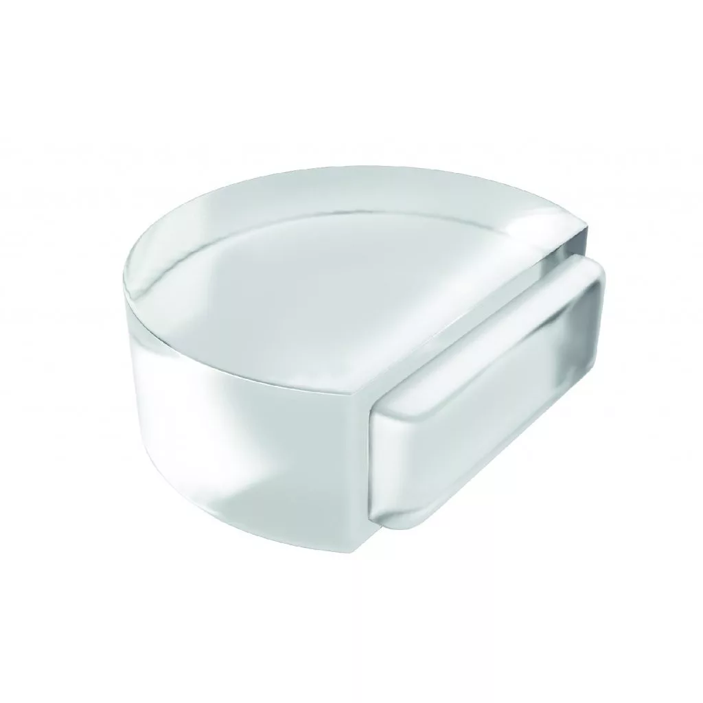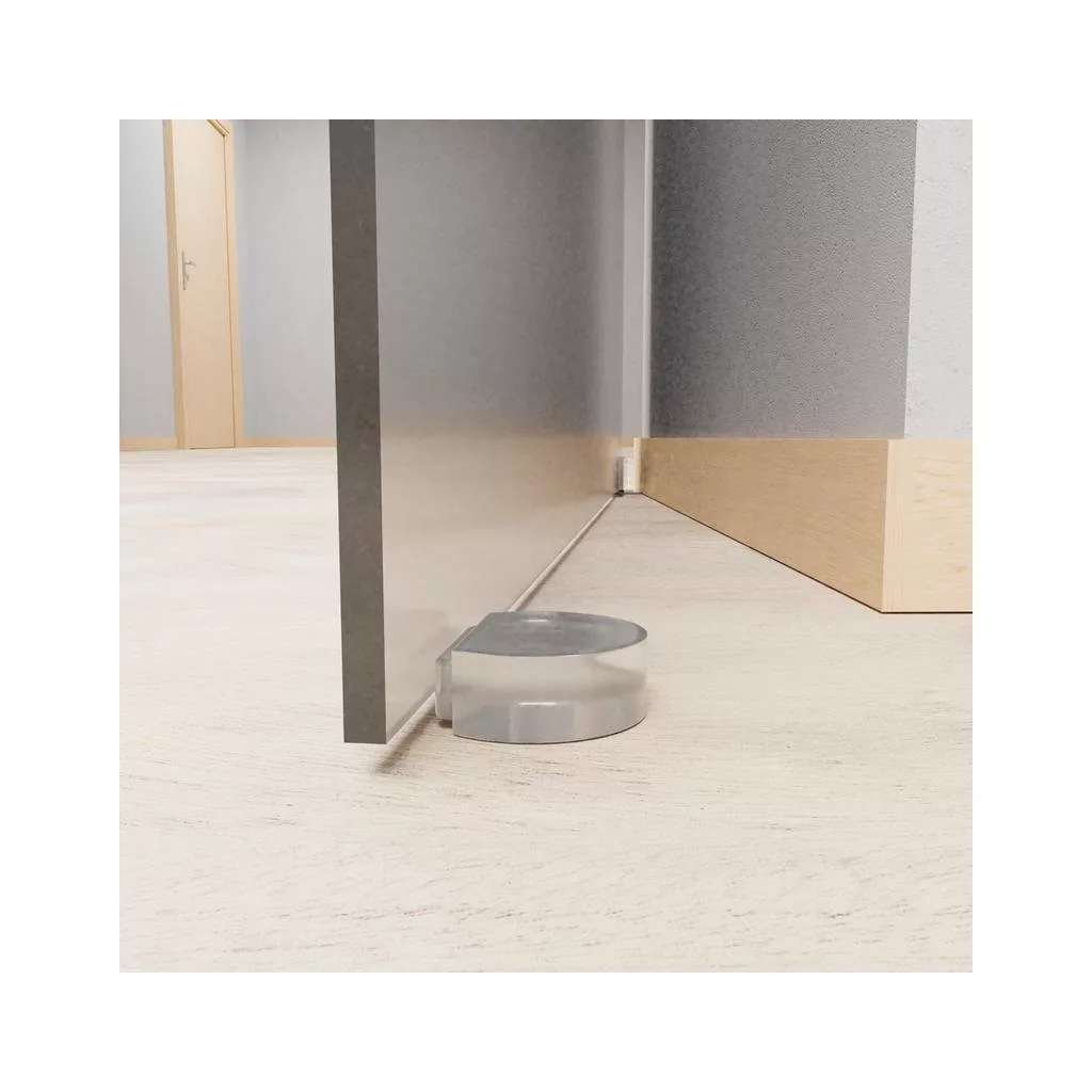 Átlátszó ajtóütköző, 45 mm széles és 15 mm magas. Védi a falakat és a bútorokat az ajtó ütődéseitől. Mindenféle sima padlóra ragasztható.