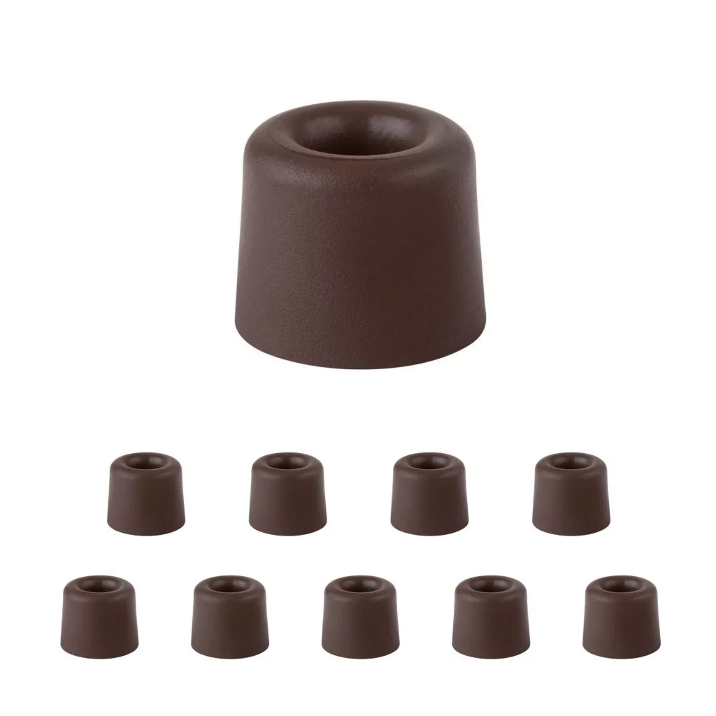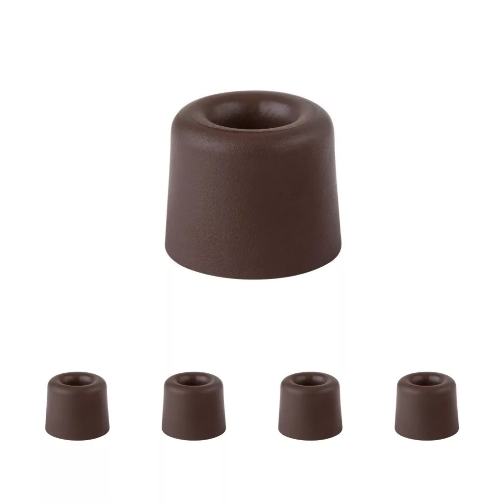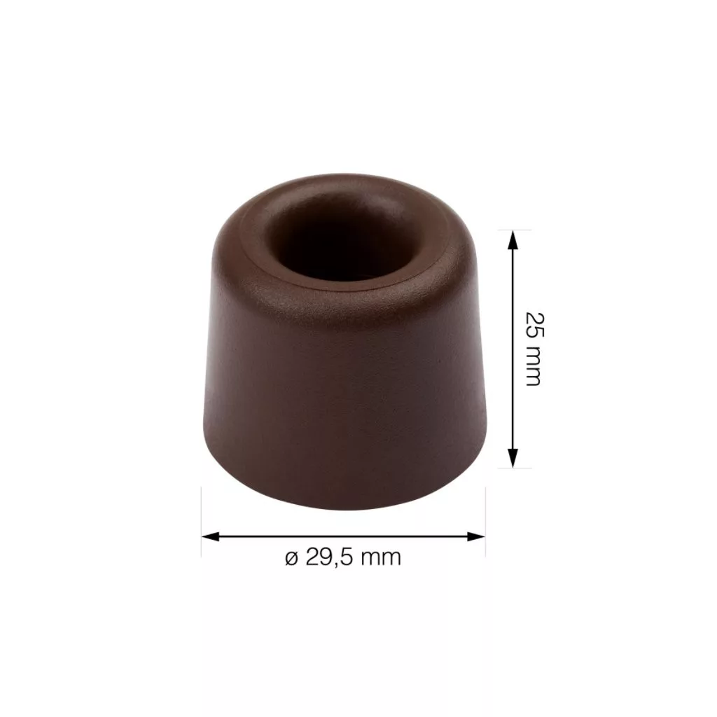 Ajtóütköző barna kivitelben, 29,5 mm átmérővel és 25 mm magassággal. Védi a falakat és a bútorokat az ajtó ütődéseitől. Minden padlótípusra csavarozható.