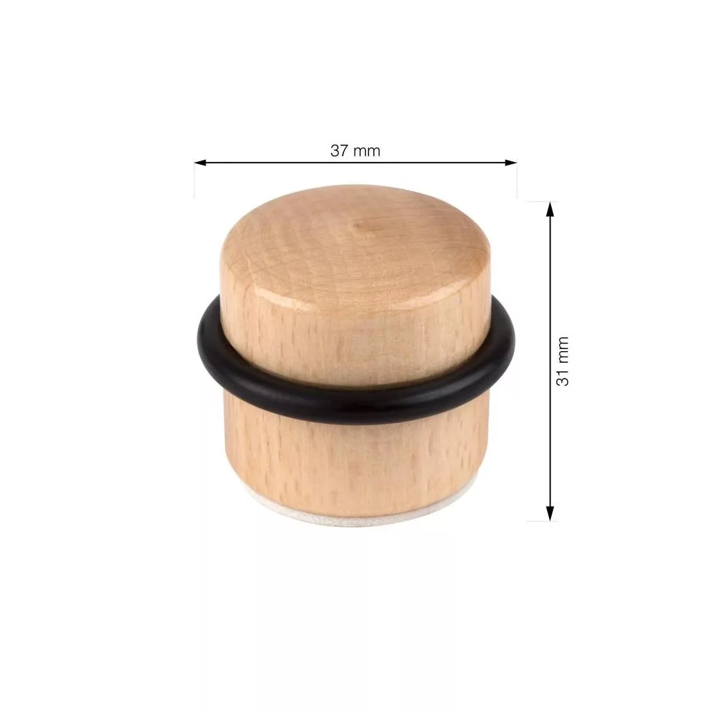 37 mm átmérőjű és 30 mm magas bükkfa ajtóütköző (gumihüvellyel együtt). Védi a falakat és a bútorokat az ajtó ütődéseitől. Minden sima padlótípusra ragasztható.