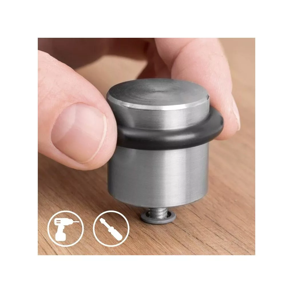 38 mm átmérőjű és 30 mm magas rozsdamentes acél ajtóütköző (gumihüvellyel együtt). Védi a falakat és a bútorokat az ajtó ütődéseitől. Minden padlótípusra csavarozható. Rögzítőanyaggal együtt.