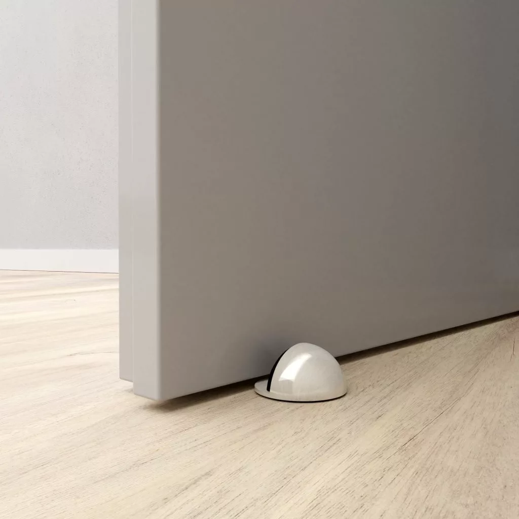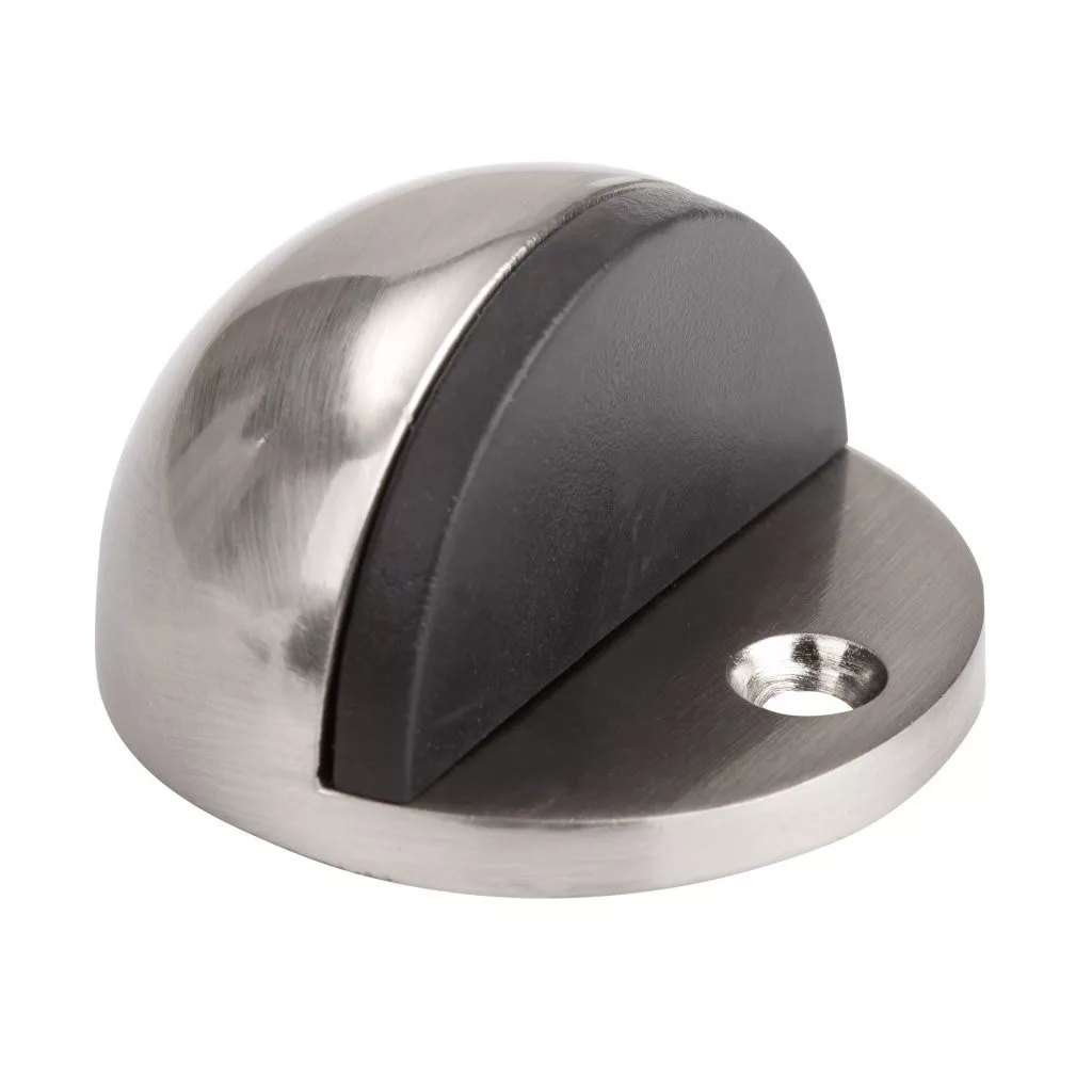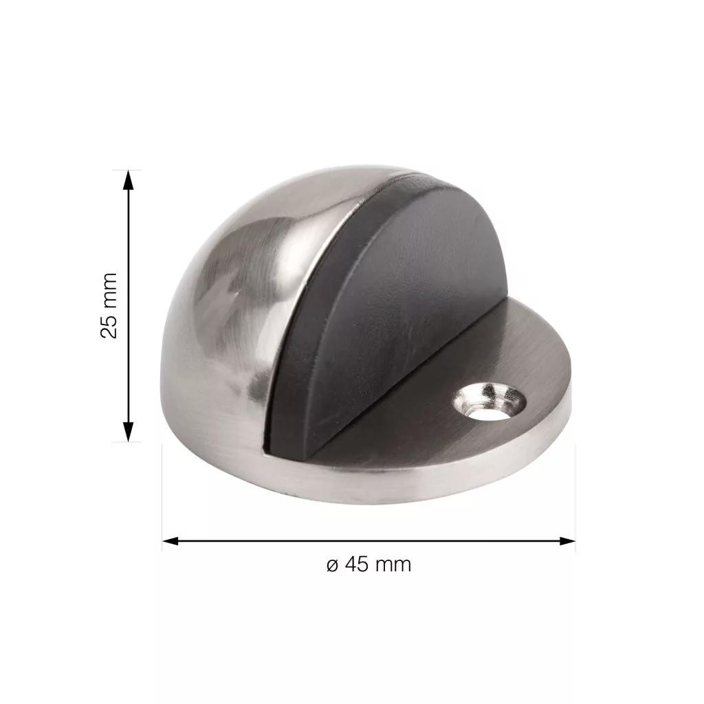 Matt nikkel bevonatú fém ajtóütköző, 45 mm átmérővel és 25 mm magassággal. Védi a falakat és a bútorokat az ajtó ütődéseitől. Minden padlótípusra csavarozható. Rögzítőanyaggal együtt.
