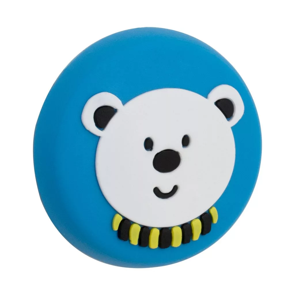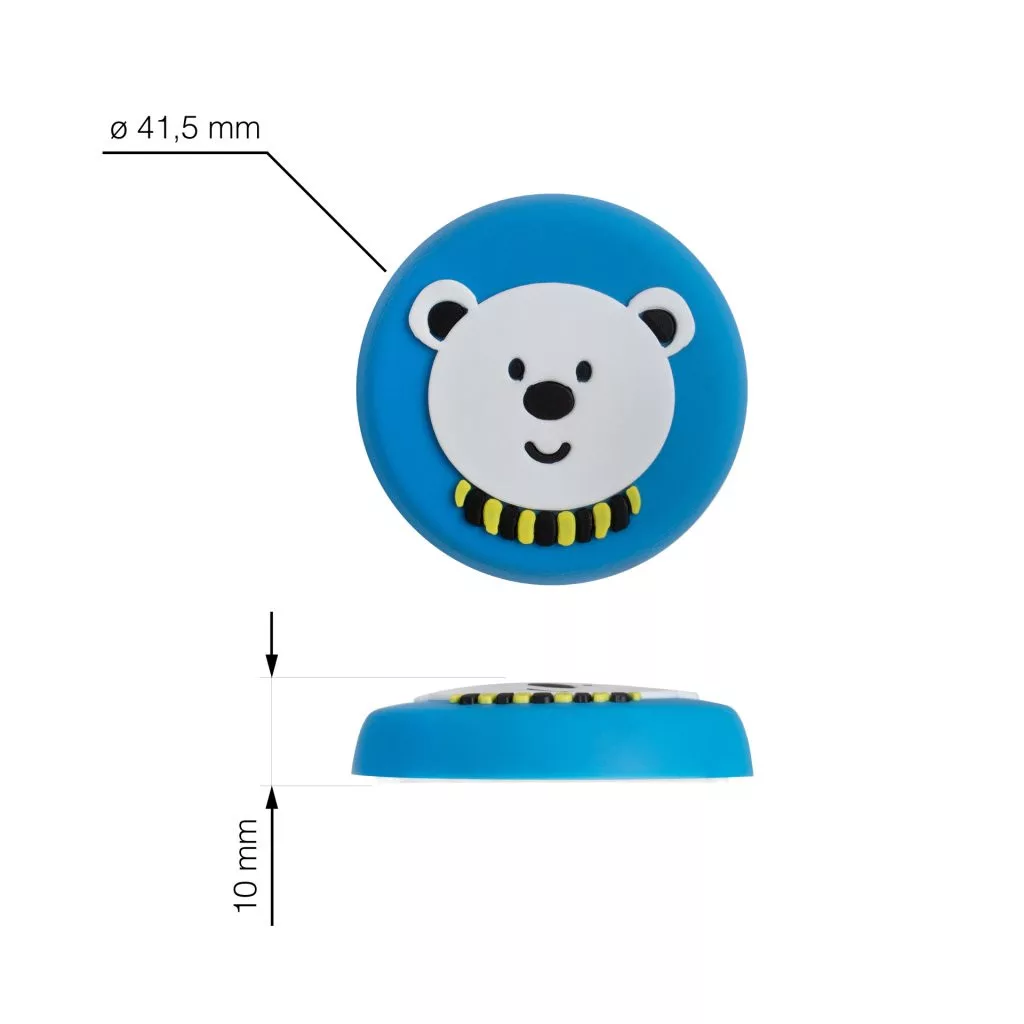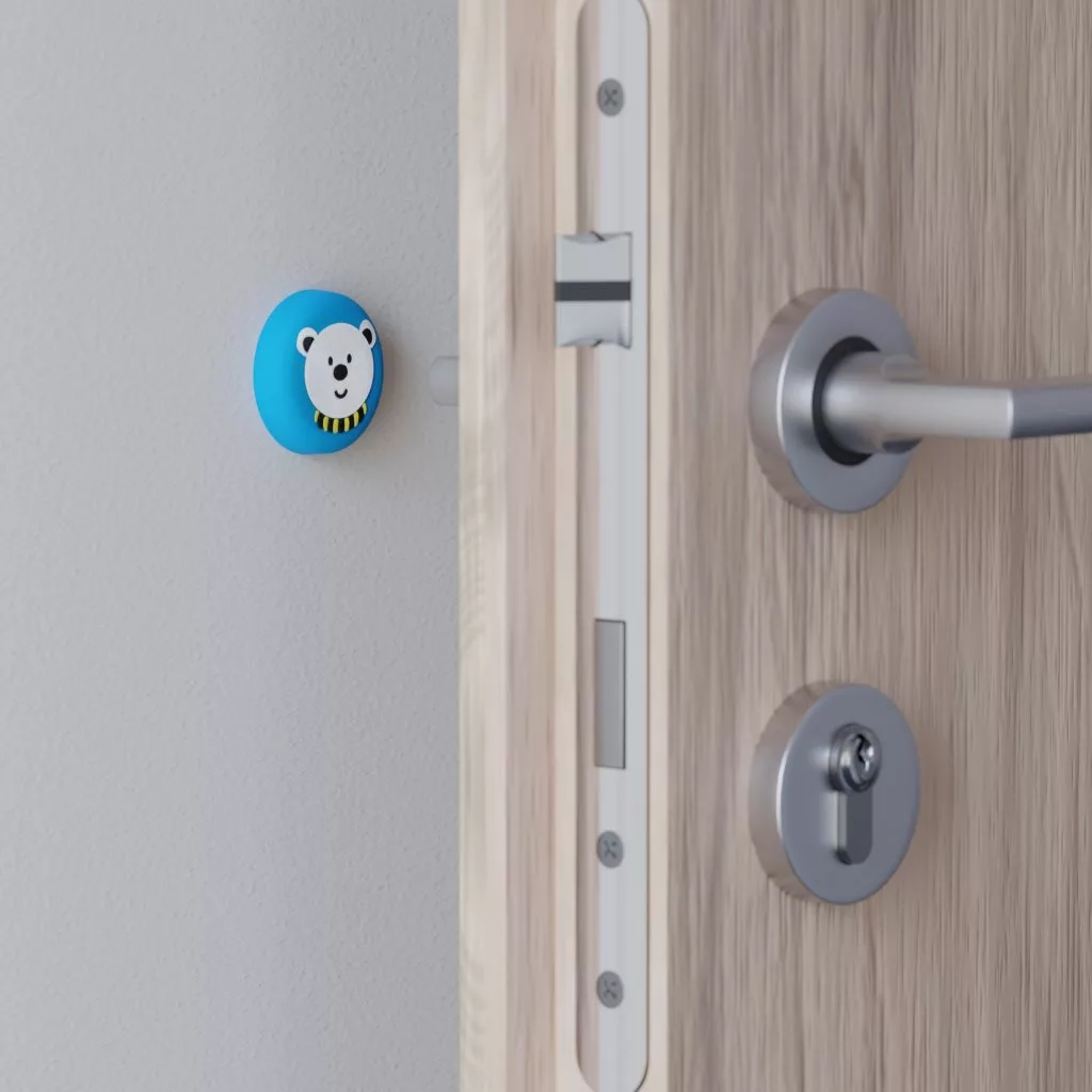 Kék színű, műanyag ajtóütköző gyermek motívummal, 41,5 mm átmérőjű. A falra ragasztható, a fogantyú magasságában.