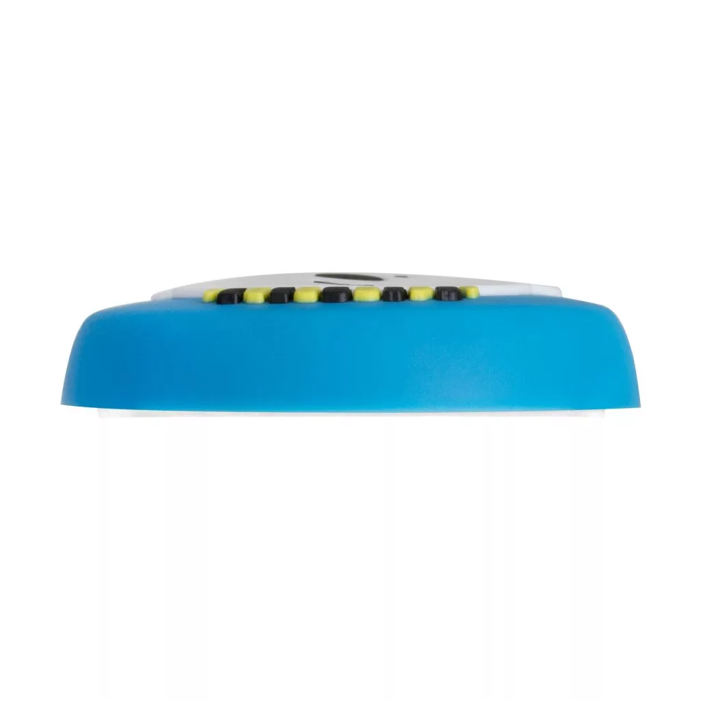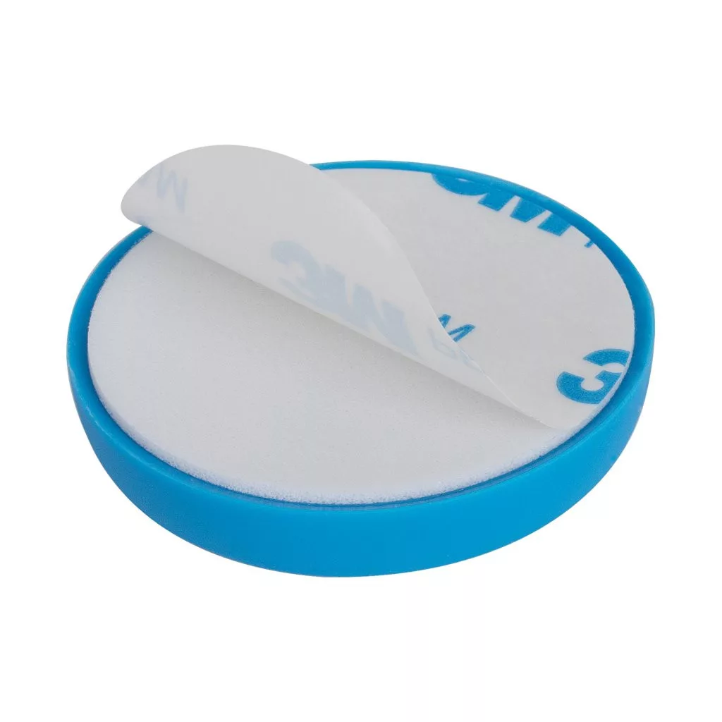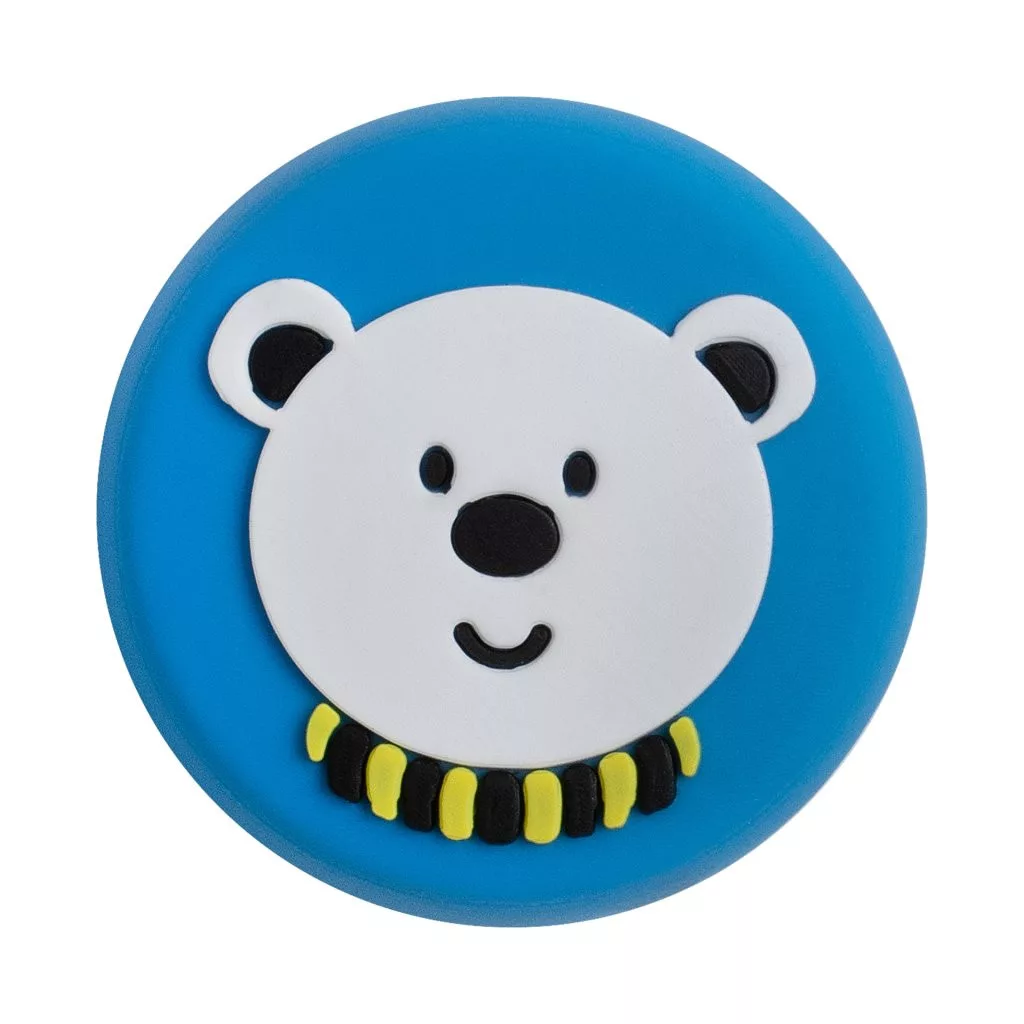 Kék színű, műanyag ajtóütköző gyermek motívummal, 41,5 mm átmérőjű. A falra ragasztható, a fogantyú magasságában.