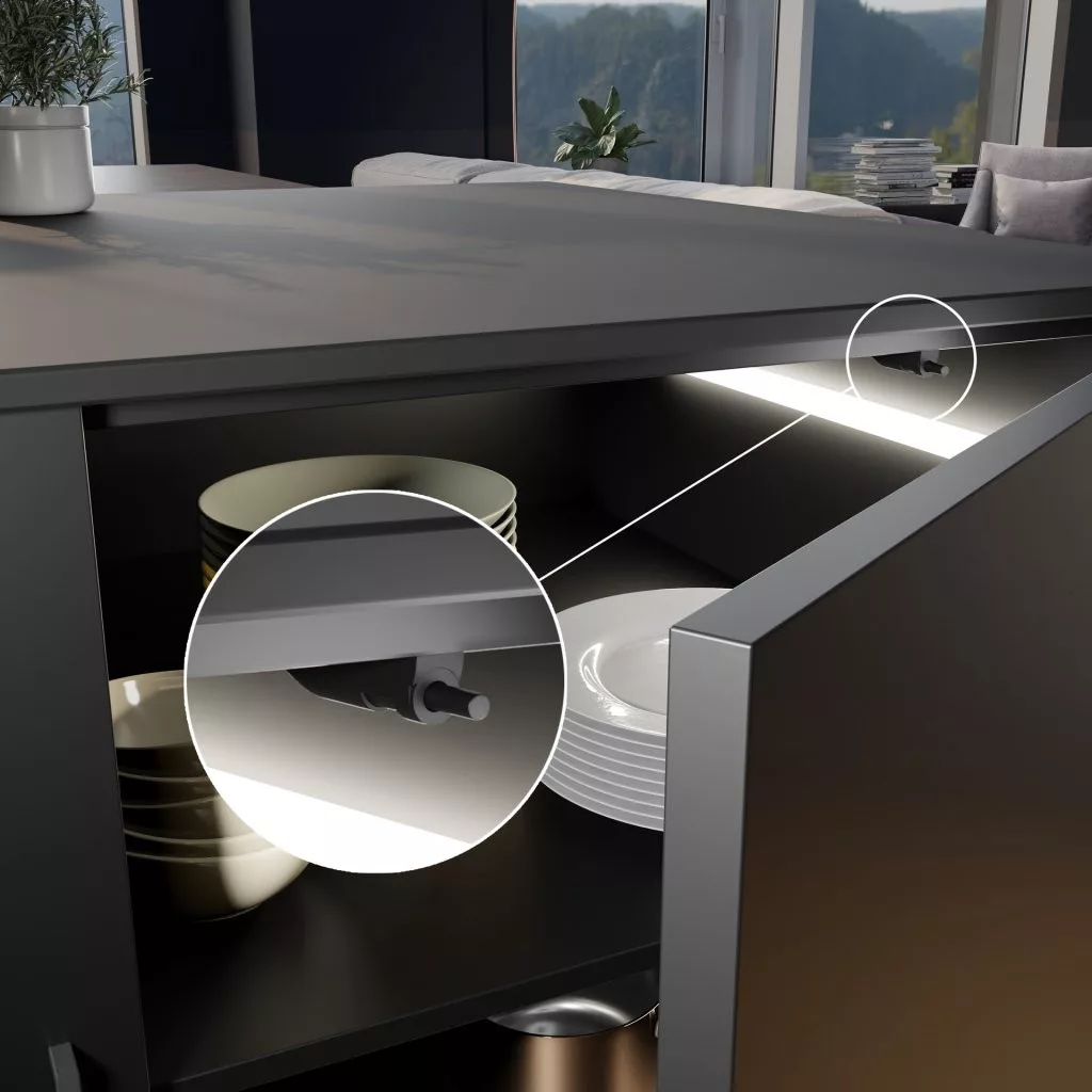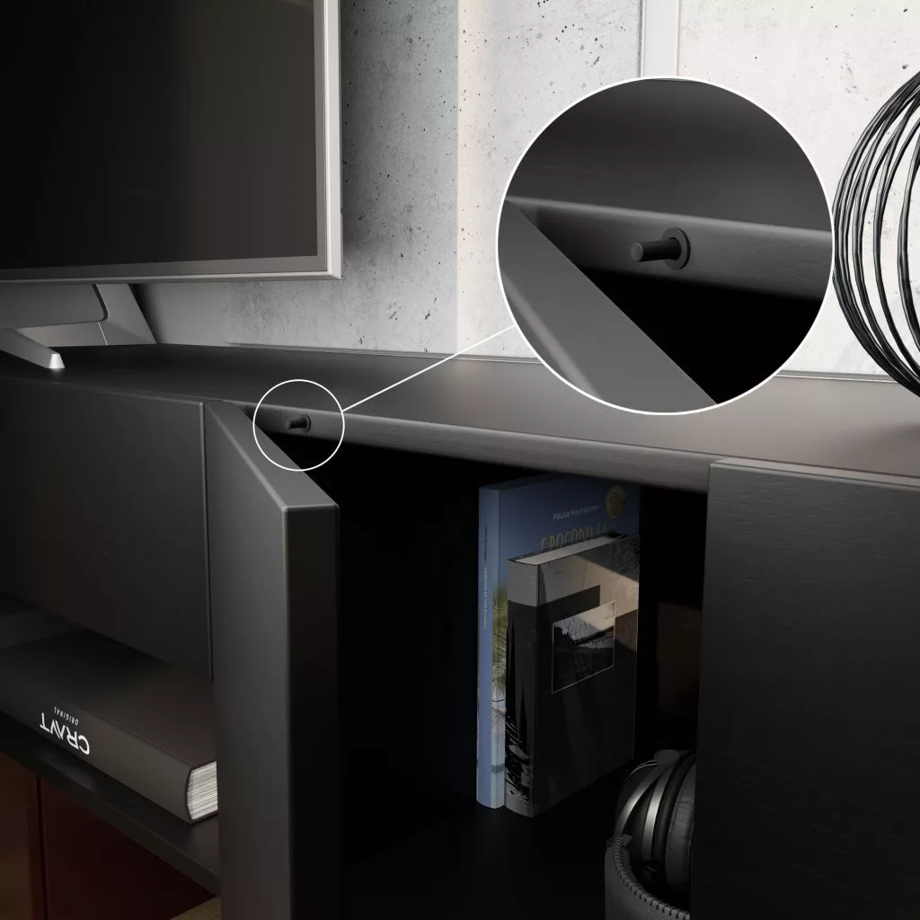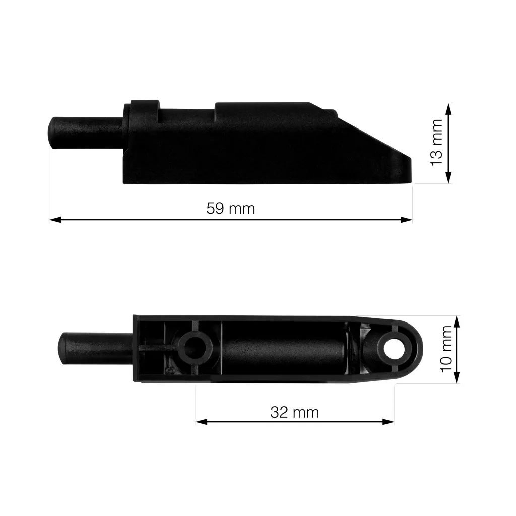 Műanyag hidropneumatikus ajtózáró lengéscsillapító, a szekrény belsejébe szerelhető. Lengéscsillapító átmérője 10 mm - alkalmas egymásra helyezett/beillesztett ajtókhoz és a szekrény belső felületére. A népszerű fekete színben a Black Edition sorozatból.