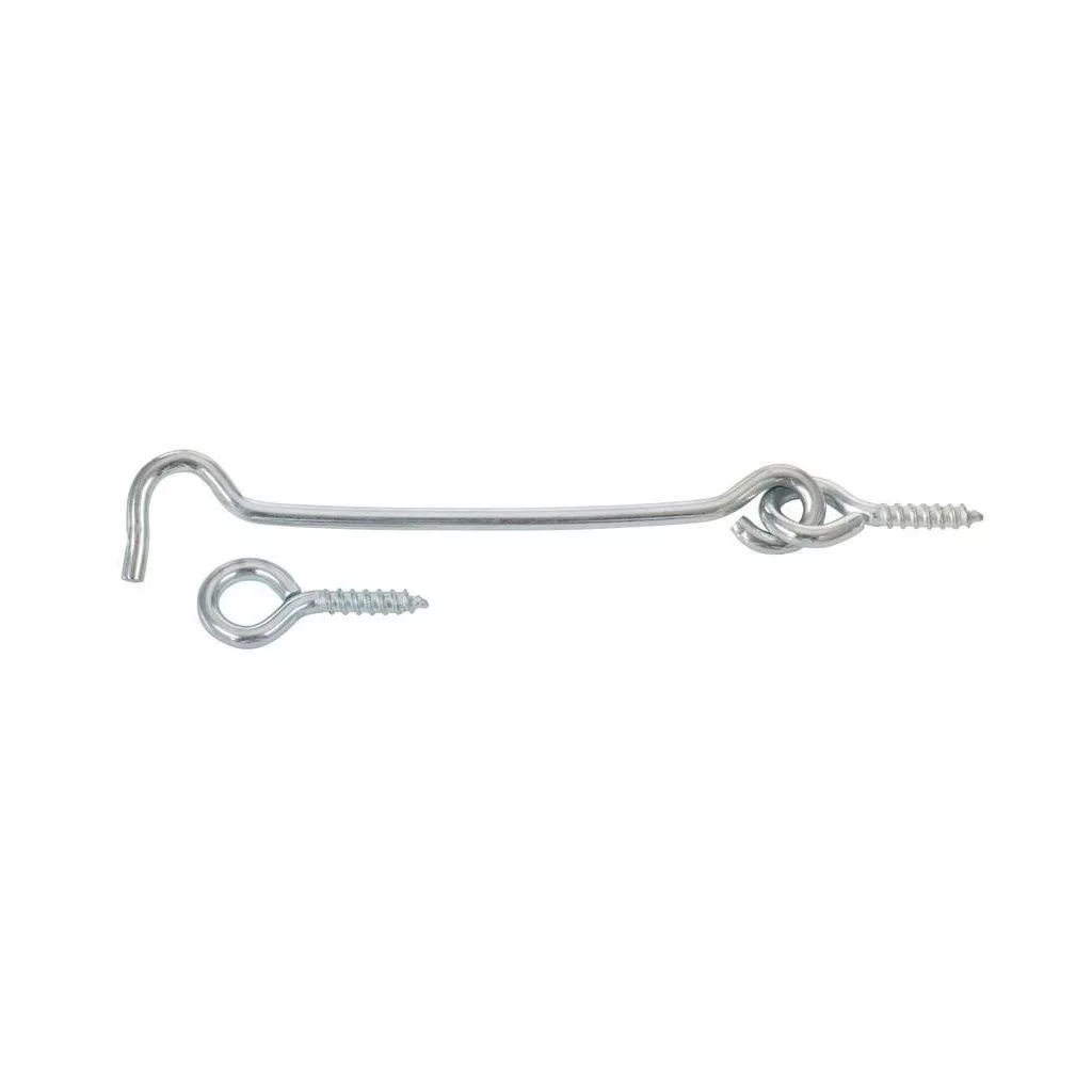 Biztonsági kampó, 120 mm hosszú, fűzőlyukkal, fába csavarozásra alkalmas. A csomag 2 db-ot tartalmaz.