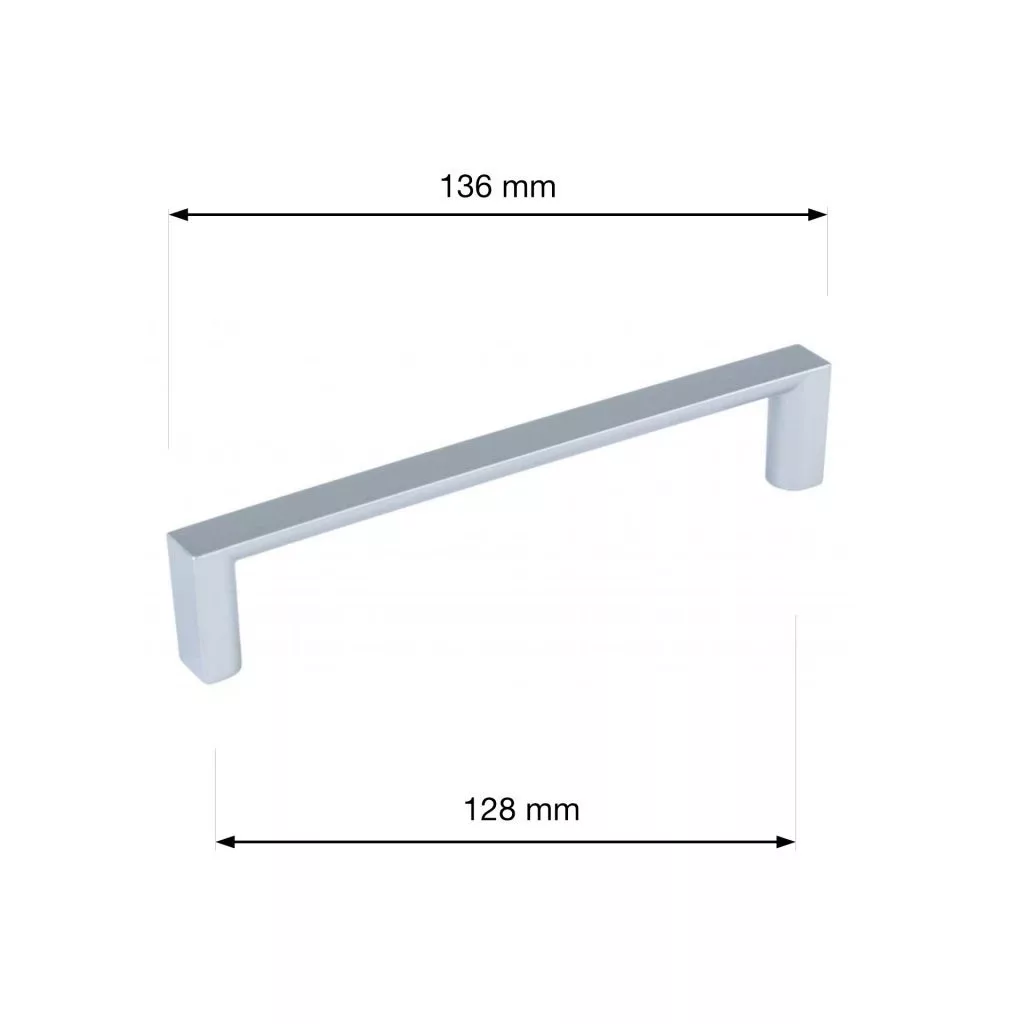 Modern műanyag bútorfogantyú 128 mm-es tengelytávolsággal, ezüst színű. A fogantyú hossza 136 mm, szélessége 11 mm és magassága 26 mm. Rögzítőcsavarokkal együtt.