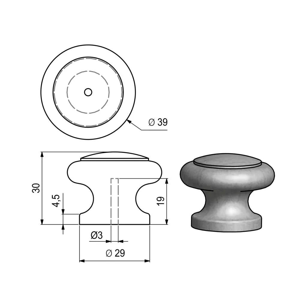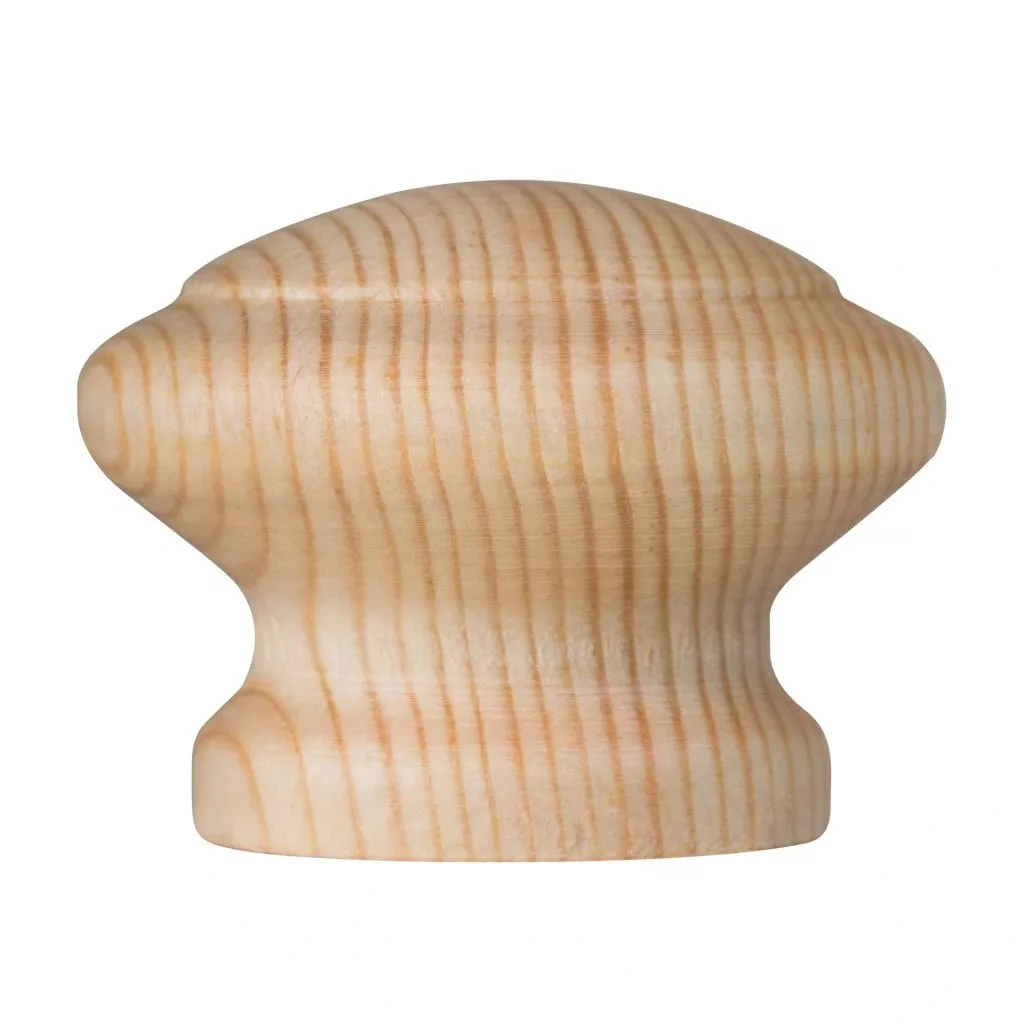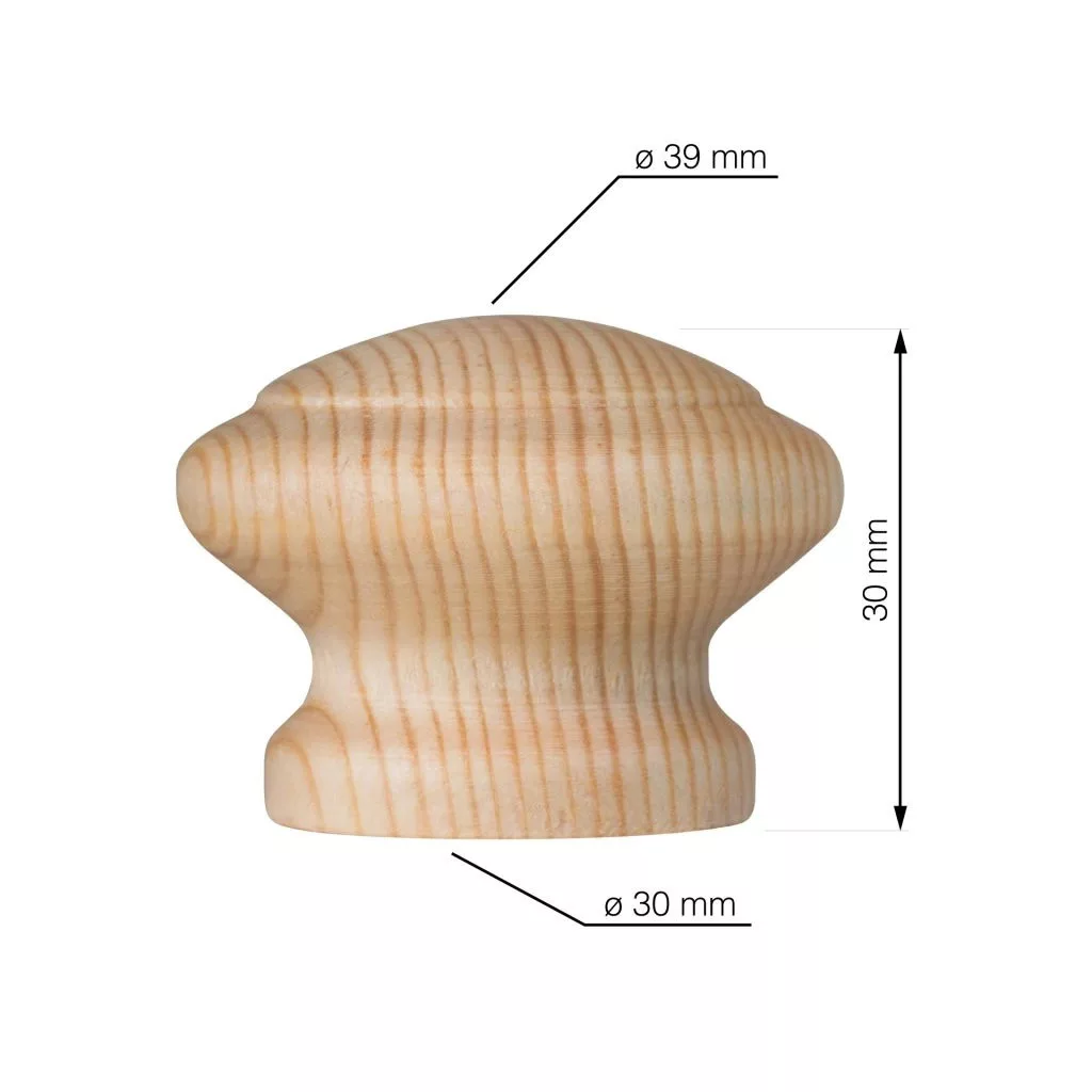 Lakkozott fenyőből készült Lea bútorgomb, 39 mm átmérőjű és 30 mm magas. A csomag tartalmaz egy rögzítőcsavart.