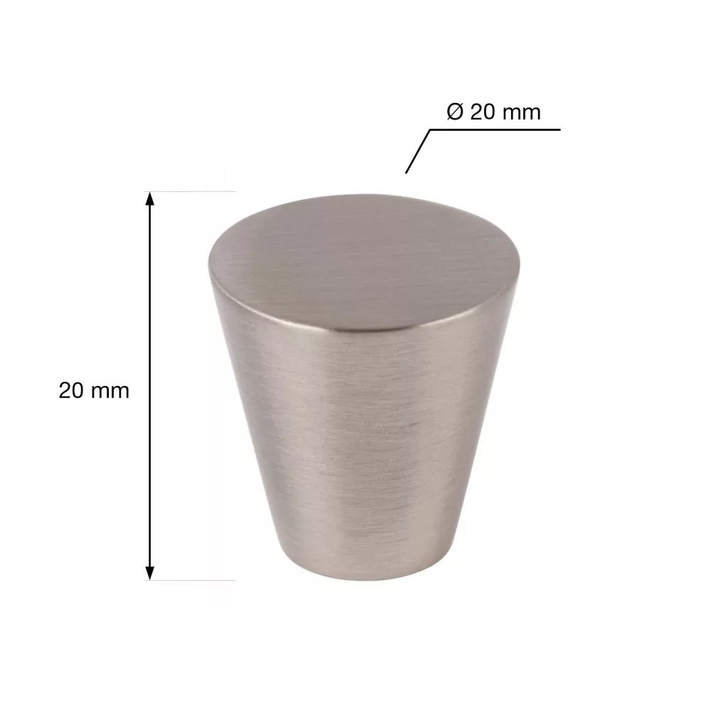 Trieste bútorgomb szálcsiszolt szatén nikkel felülettel, 20 mm átmérőjű és 20 mm magas. Rögzítőcsavarral együtt.