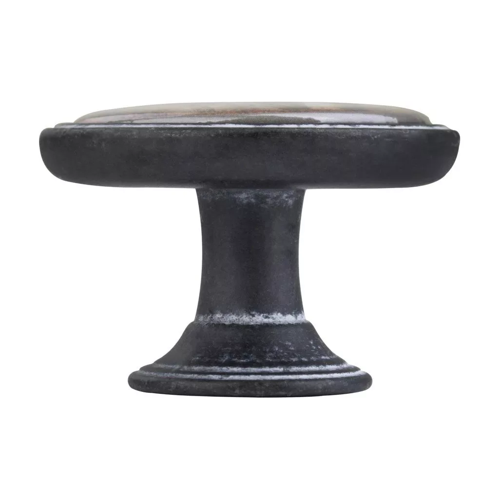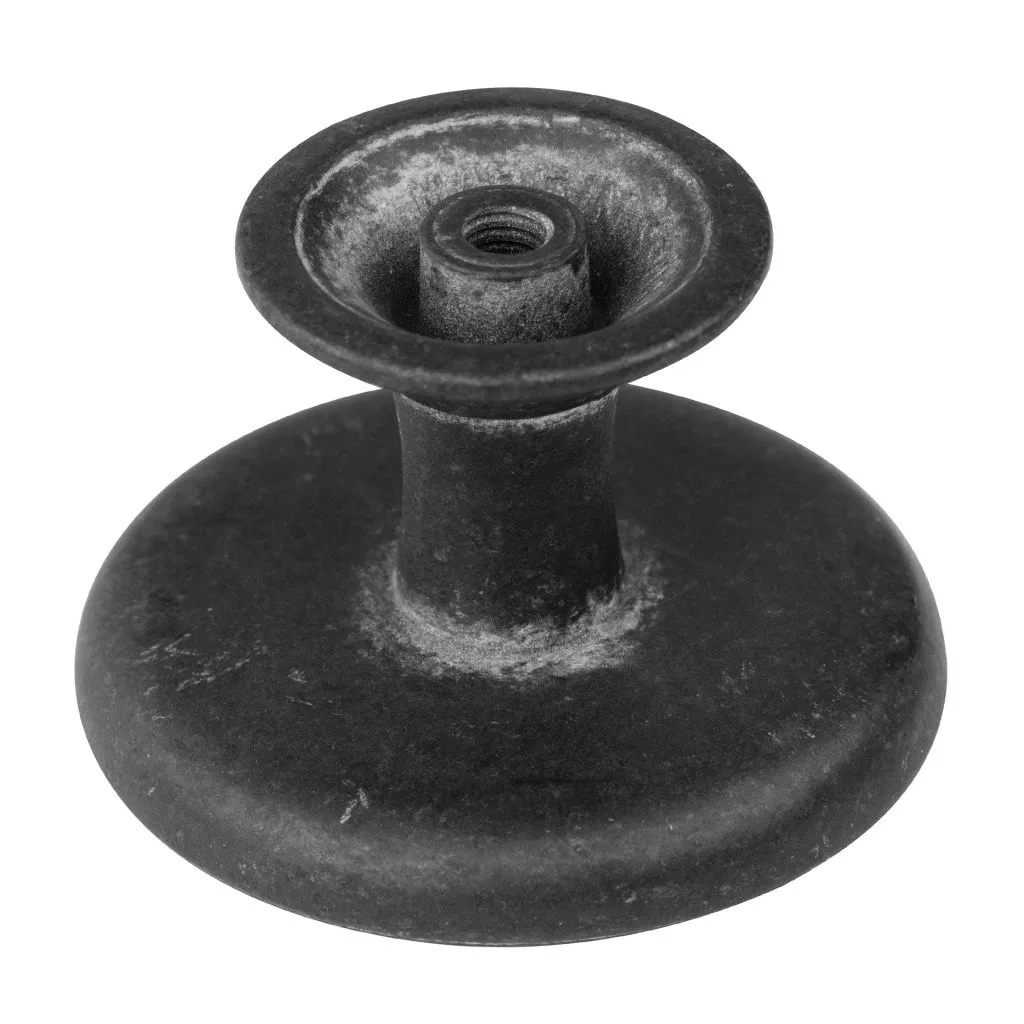 Rusztikus bútorgomb Woman I fekete rozsda mintával, 37 mm átmérőjű és 26 mm magas. A csomag tartalmaz egy rögzítőcsavart.