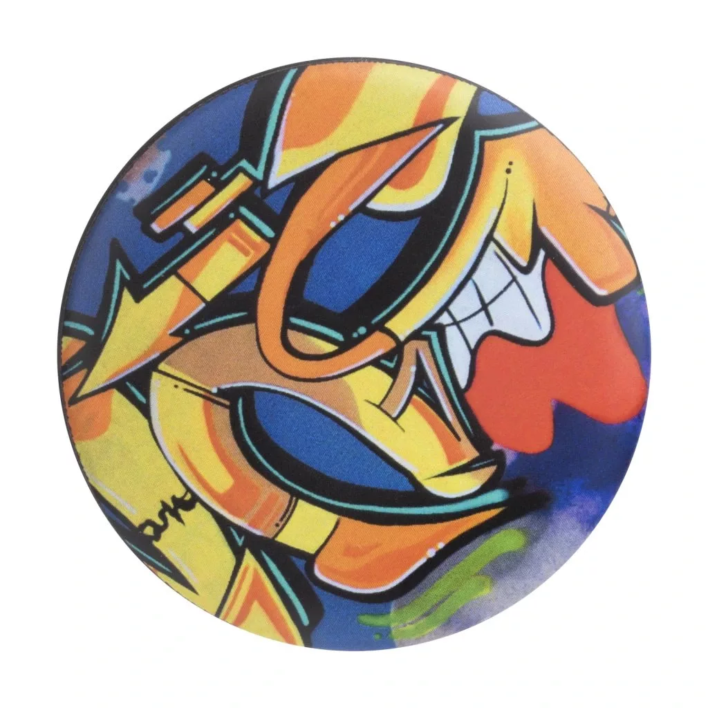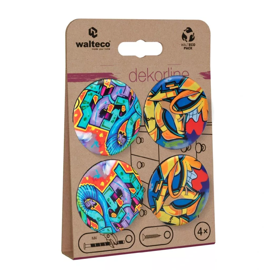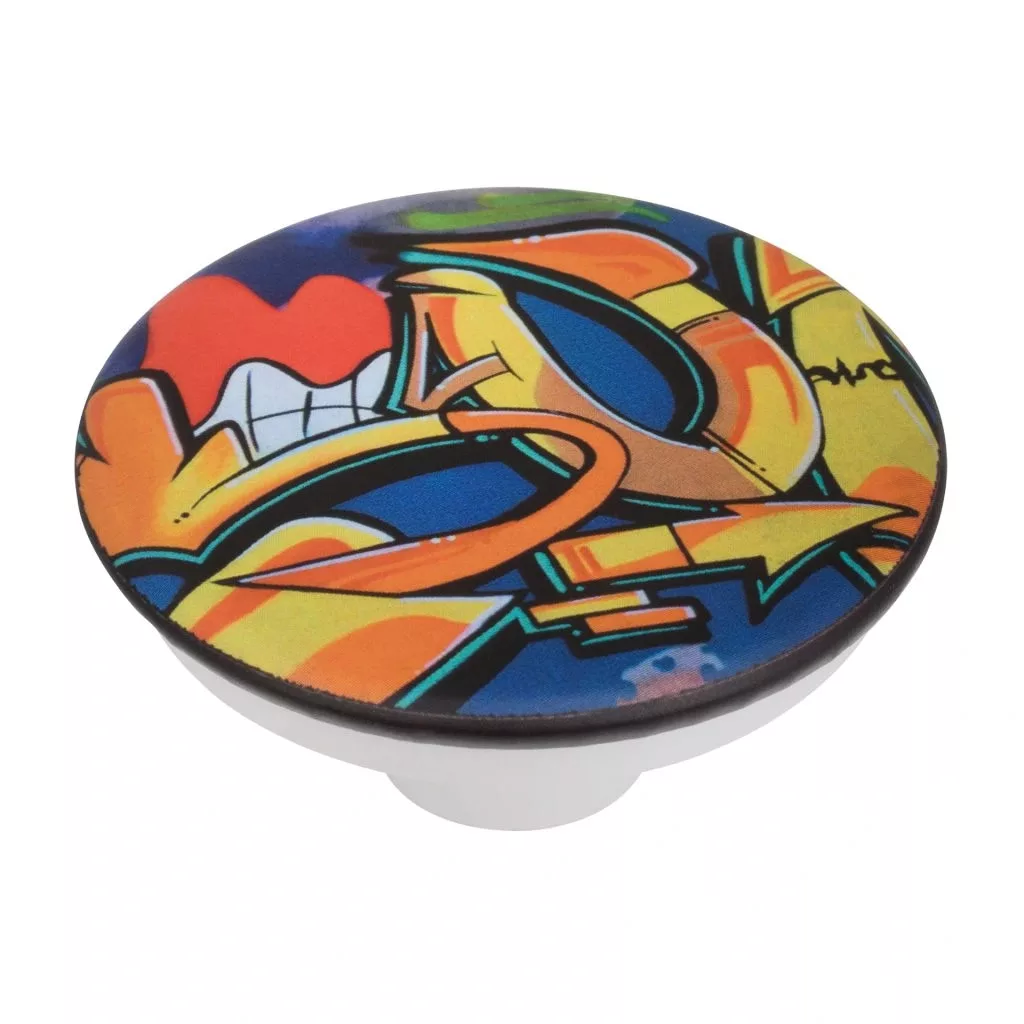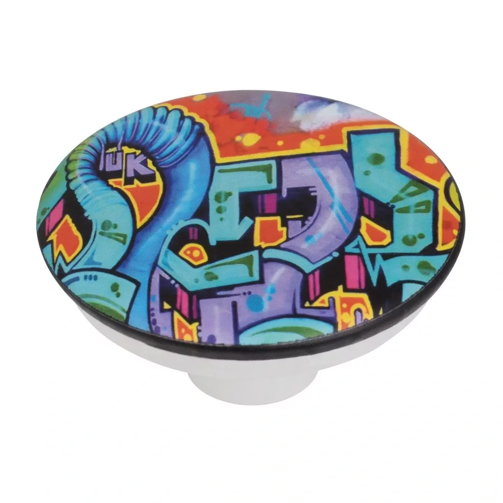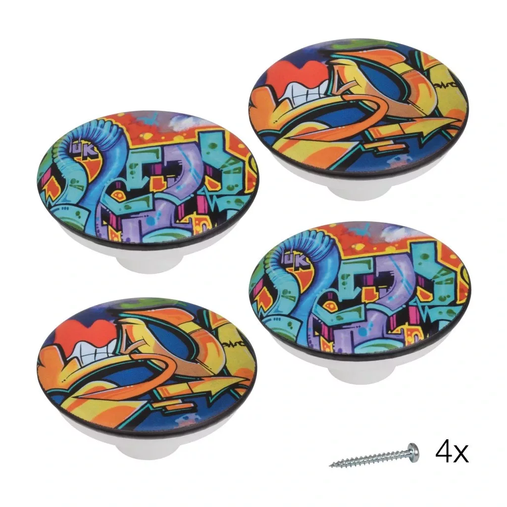 Műanyag bútorgombok szett két színes graffiti motívummal, 50 mm átmérőjű és 24 mm magas. A csomag 4 gombot és mindegyikhez egy rögzítőcsavart tartalmaz.