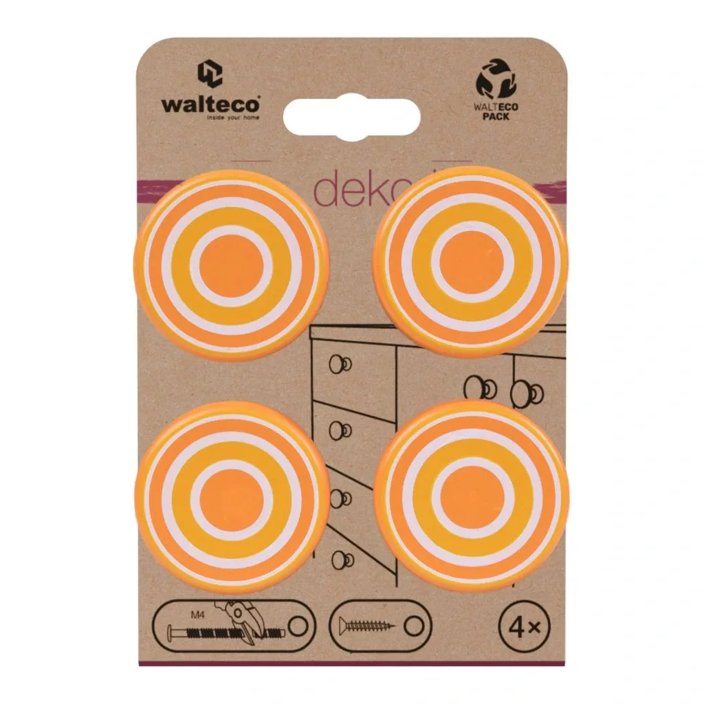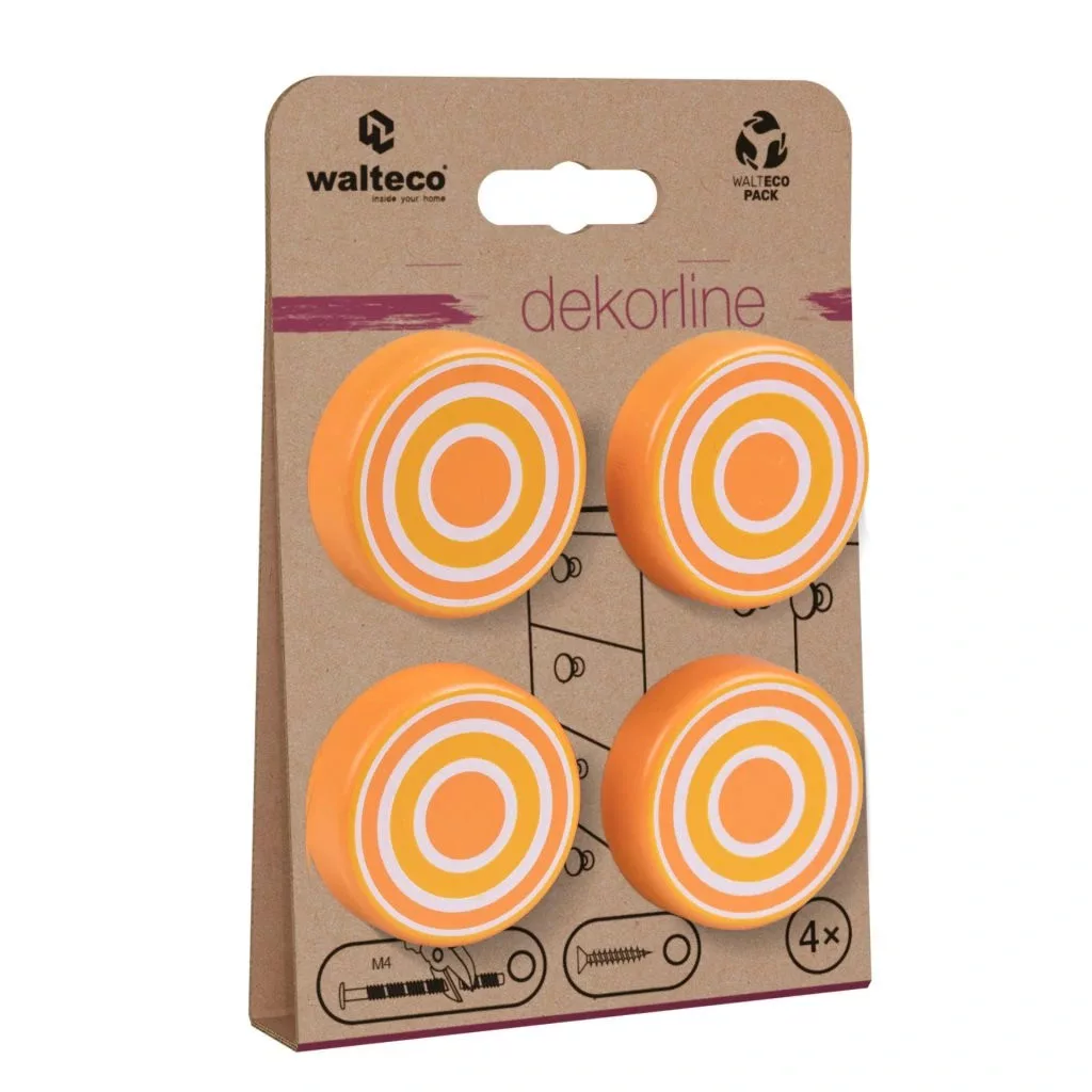 4 db narancssárga kör motívummal ellátott bútorgomb-készlet, átmérője 40 mm, magassága 28 mm. A csomag 4 gombot és mindegyikhez egy rögzítőcsavart tartalmaz.