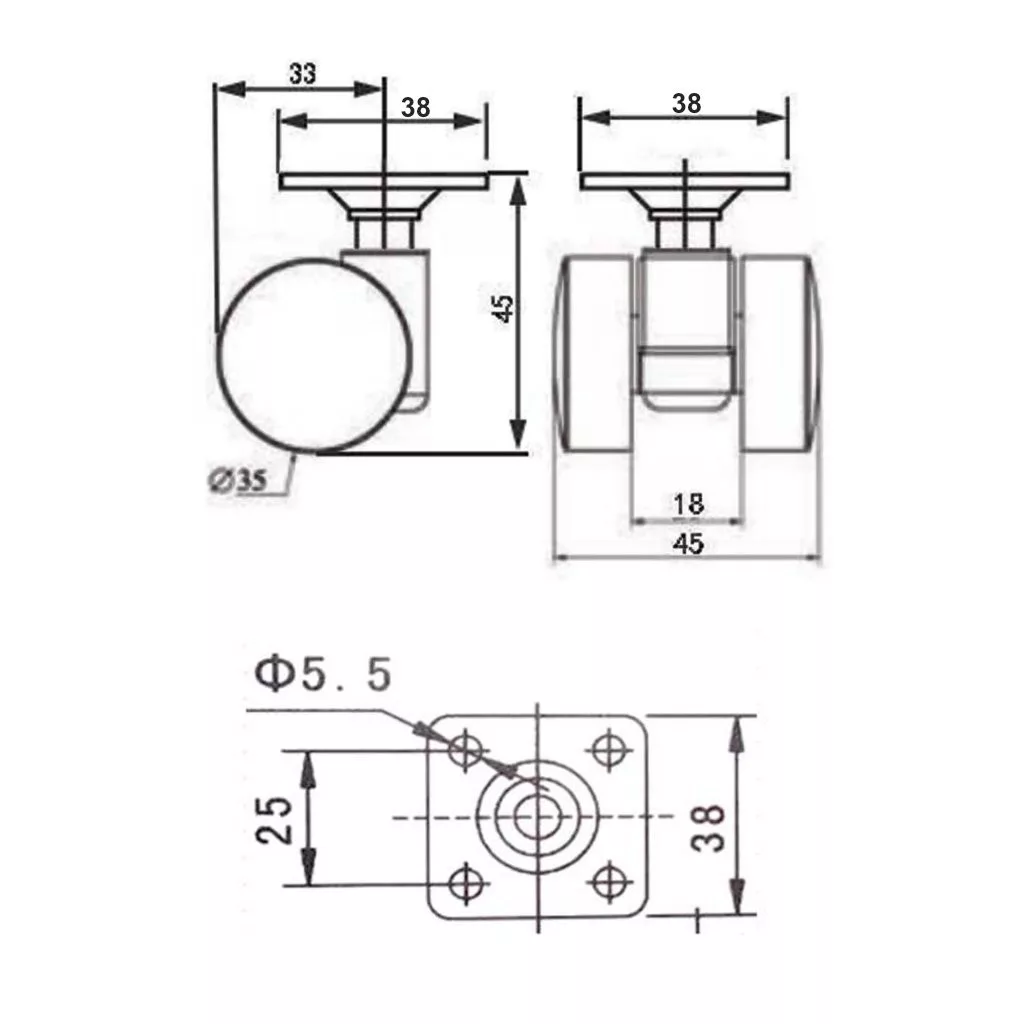 35 mm átmérőjű bútorgörgő 38x38 mm-es talppal. Puha padlóra tervezve, teherbírása akár 70 kg.