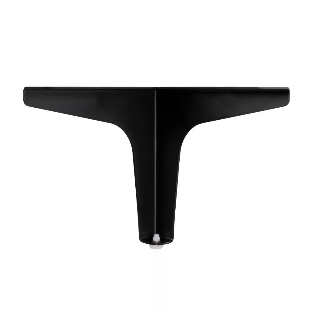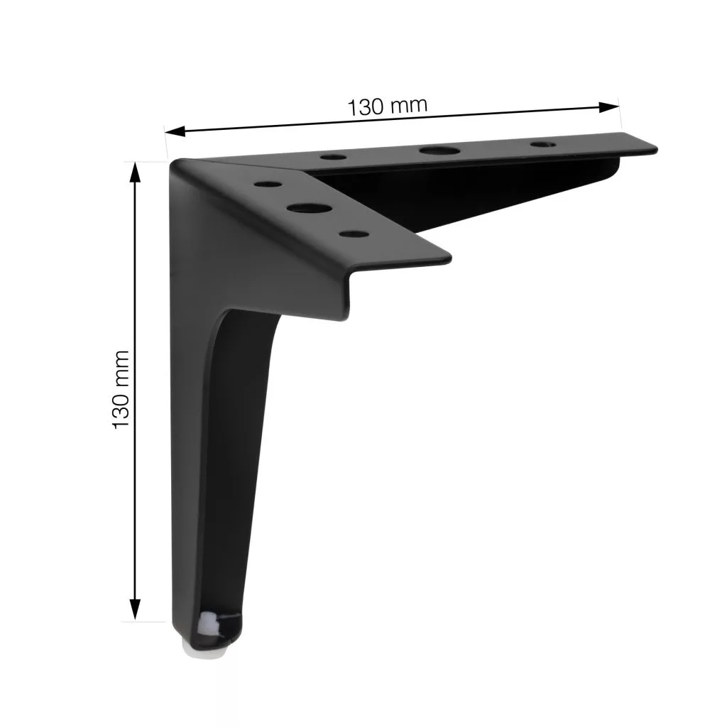 Fekete fém bútorláb, 130 mm szélességgel, magassággal és mélységgel. A 130x130x28 mm méretű lemez biztosítja a bútor szilárd rögzítését. A bútorláb hozzáillő oldala fehér műanyag csúszótalppal van ellátva.