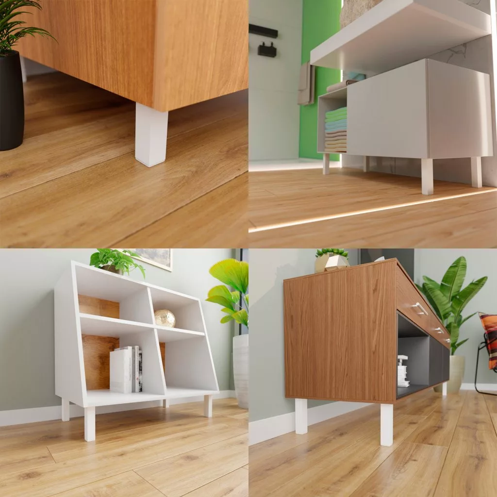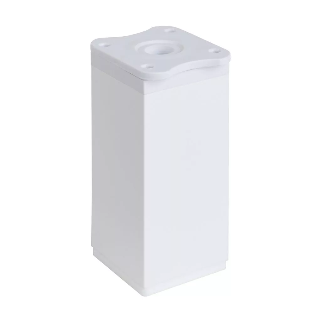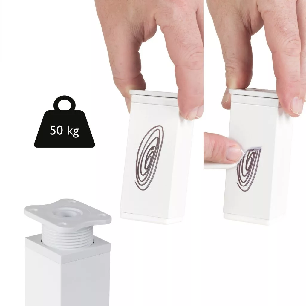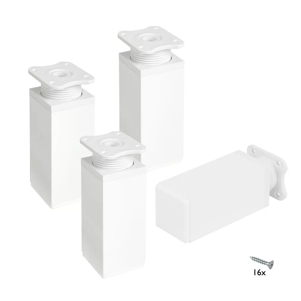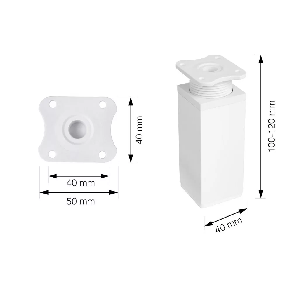 Négyzet alakú műanyag bútorlábak, fehér színűek, 40x40 mm-es profillal, 100-120 mm között állítható magassággal (a jobb stabilitás érdekében 115 mm-re történő kicsavarást javasoljuk) és egy alsó műanyag csúszótalppal. A csomag 4 darab lábat és 16 darab rögzítőcsavart tartalmaz. Cikkünk segít a magasságban állítható bútorlábak kiválasztásában.