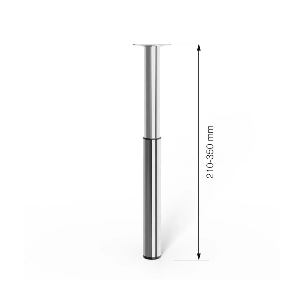 Magasságban állítható kerek bútorláb króm felülettel, 30/25 mm átmérővel és 50 kg teherbírással. A bútorláb alapmagassága 210 mm, felfelé csavarva 350 mm-ig állítható.