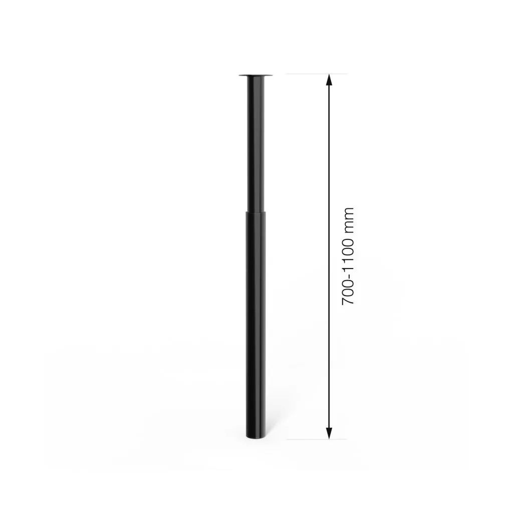 Magasságban állítható kerek bútorláb fekete kivitelben, 60/50 mm átmérővel és 80 kg teherbírással. A bútorláb alapmagassága 700 mm, felfelé csavarozva 1100 mm-ig állítható. Cikkünk segít a magasságban állítható bútorlábak kiválasztásában.