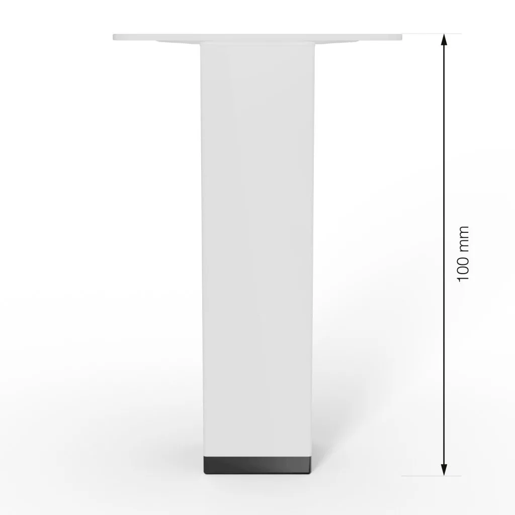 Négyzet alakú fém bútorláb fehér színben, 25x25 mm-es profillal, 100 mm magas, 60x60 mm-es lemezzel és alsó műanyag csúszótalppal.