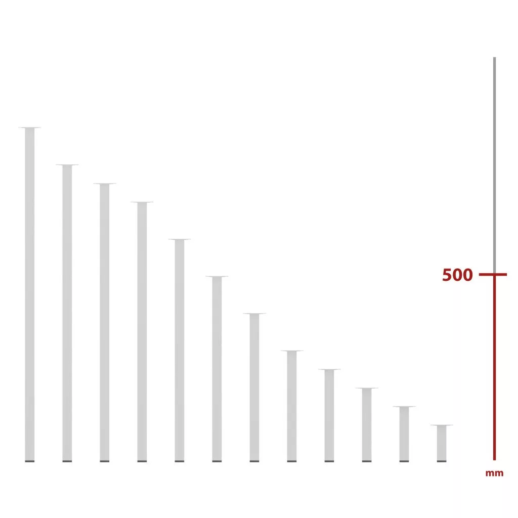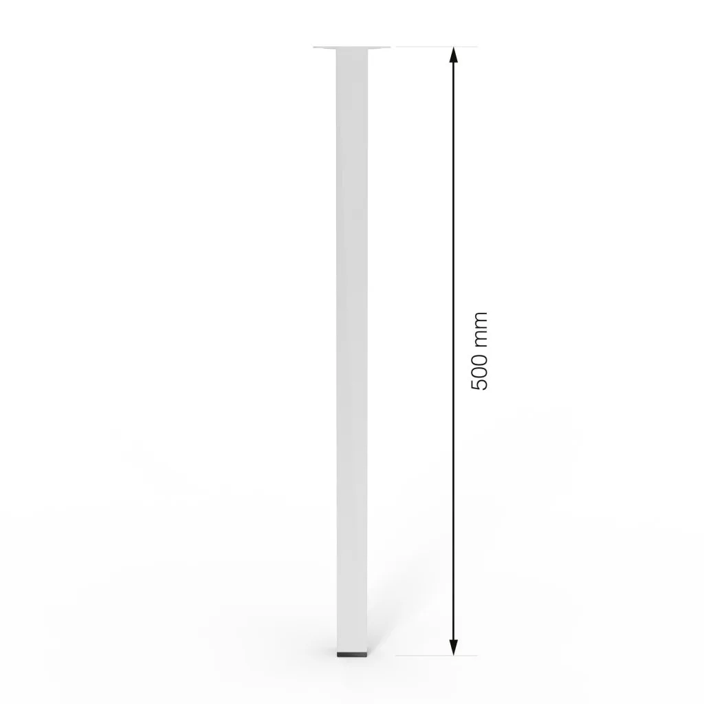 Négyzet alakú fém bútorláb fehér színben, 25x25 mm-es profillal, 500 mm magas, 60x60 mm-es lemezzel és alsó műanyag csúszótalppal.