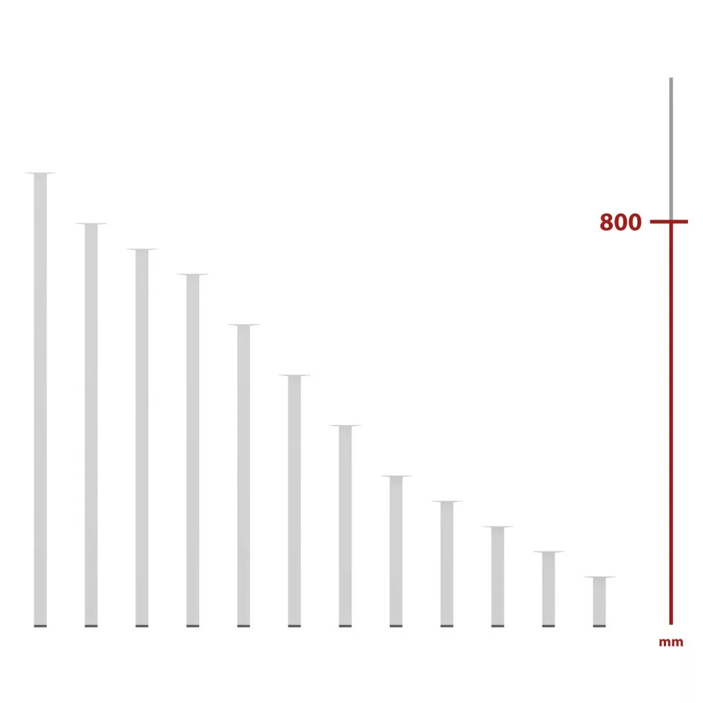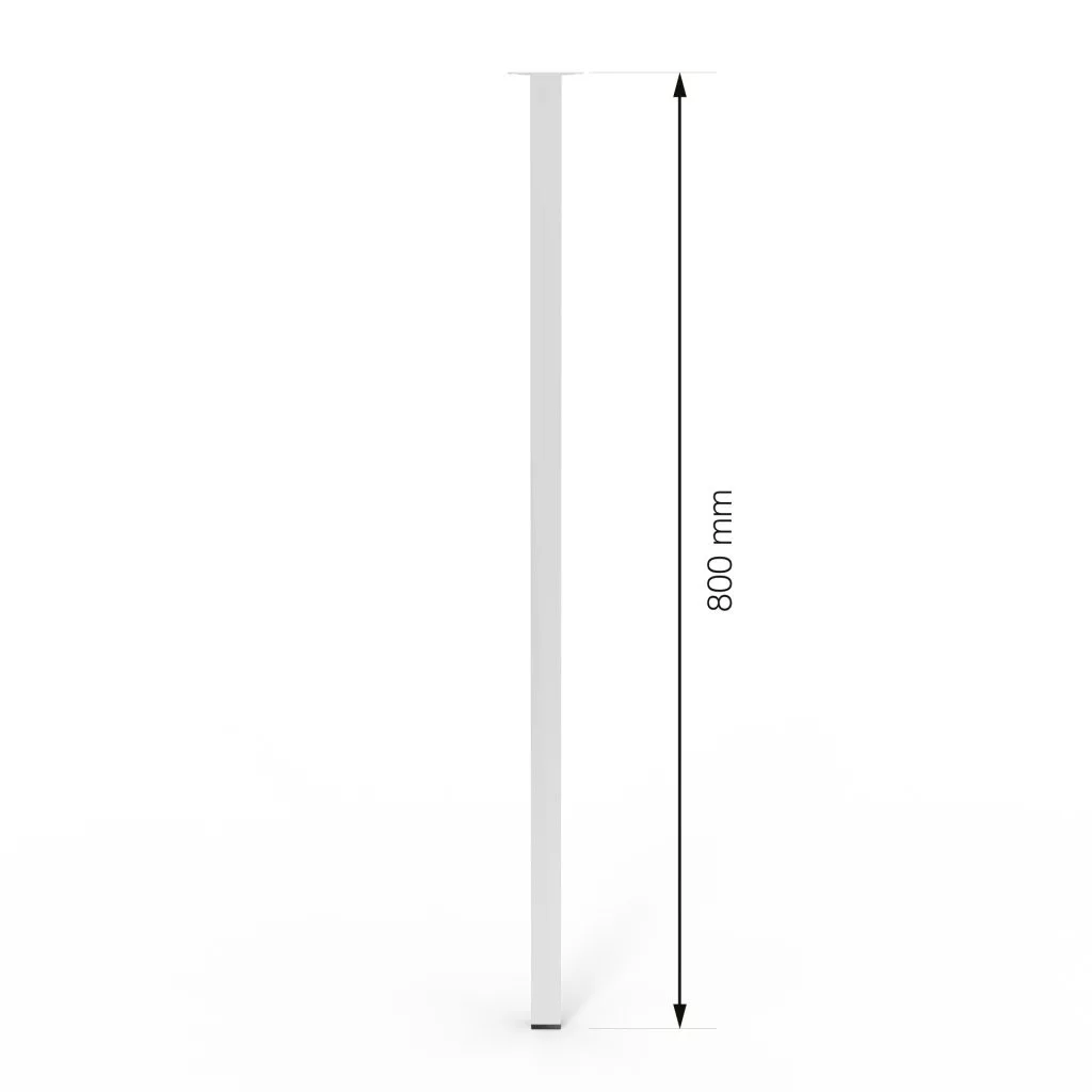 Négyzet alakú fém bútorláb fehér színben, 25x25 mm profilból, 800 mm magas, 60x60 mm-es talppal és alsó műanyag csúszótalppal.
