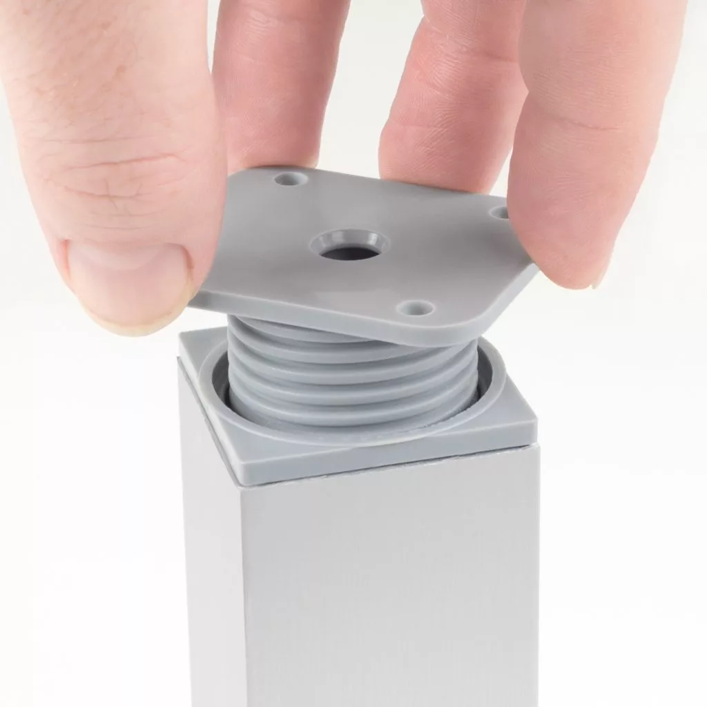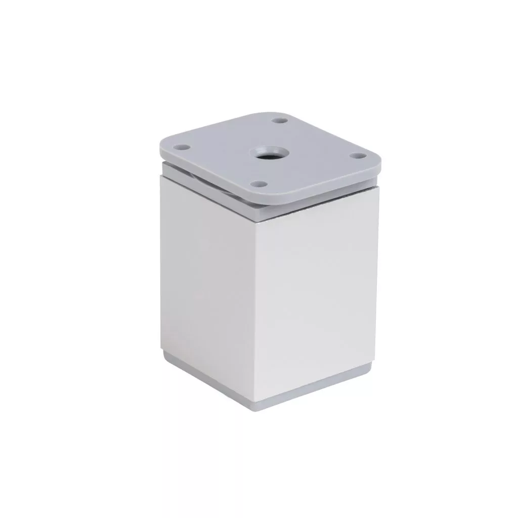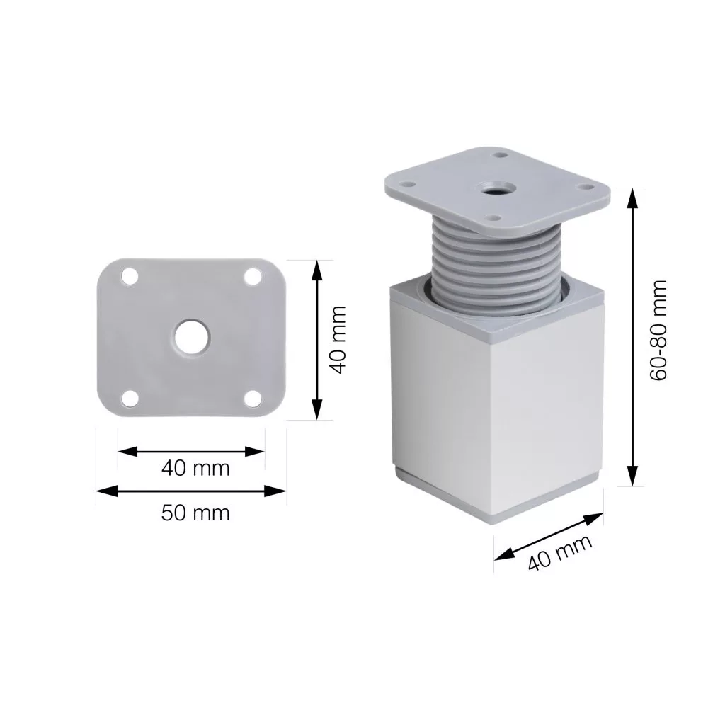 Négyzet alakú műanyag bútorláb ezüst színben, 40x40 mm-es profillal, 60-80 mm-ig állítható magassággal és alsó műanyag csúszótalppal. Cikkünk segít a magasságban állítható bútorlábak kiválasztásában.