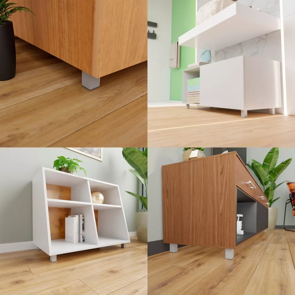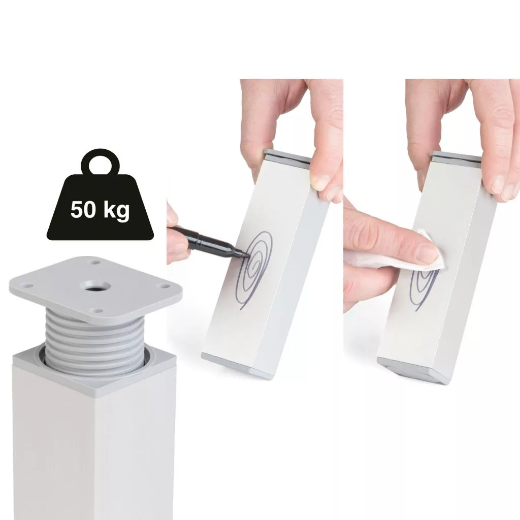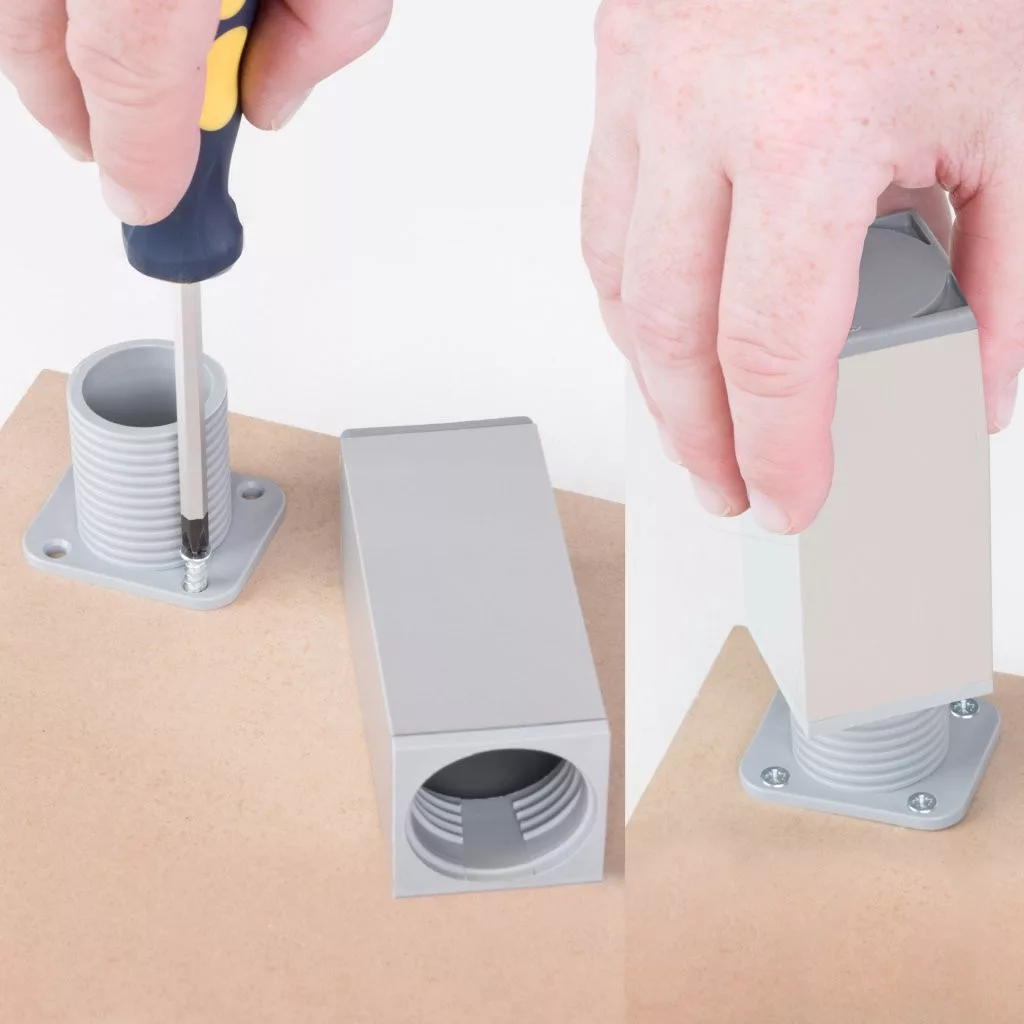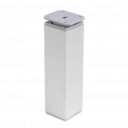 Négyzet alakú műanyag bútorláb ezüst színben, 40x40 mm-es profillal, 60-80 mm-ig állítható magassággal és alsó műanyag csúszótalppal. Cikkünk segít a magasságban állítható bútorlábak kiválasztásában.