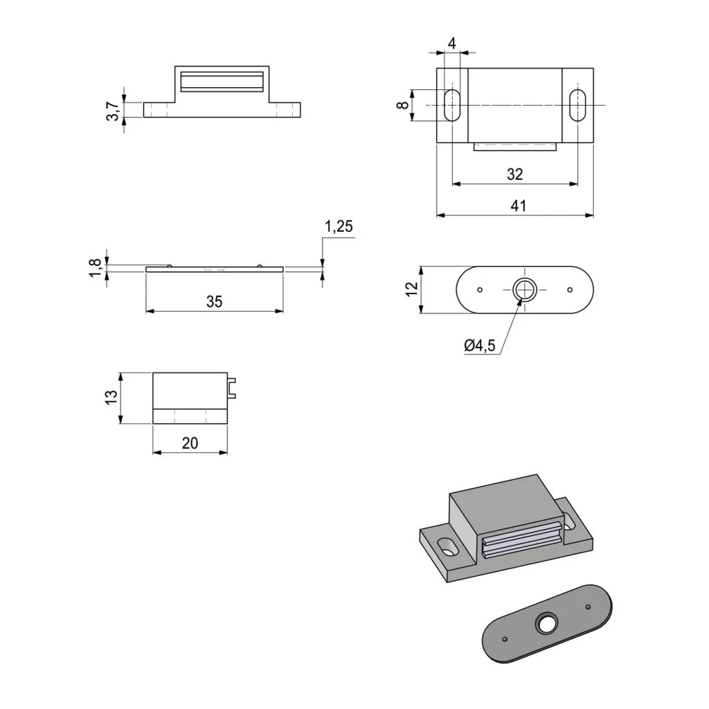 41 mm széles, fehér színű bútormágnes, teherbírása 2,5 - 3,5 kg. A csomag 2 db-ot tartalmaz.