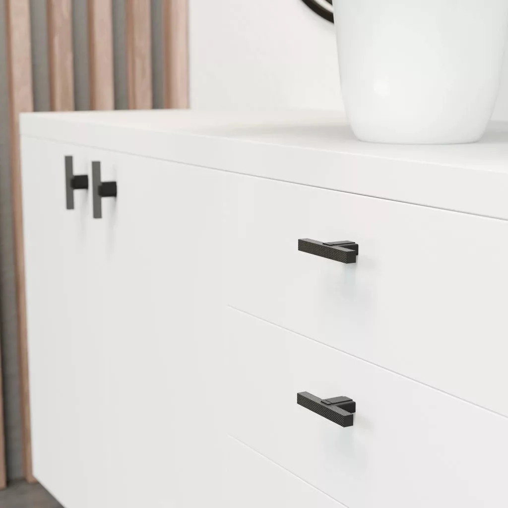 Corso bútorgomb modern matt fekete dizájnnal, 65 mm széles és 27,5 mm magas. Rögzítőcsavarral együtt.