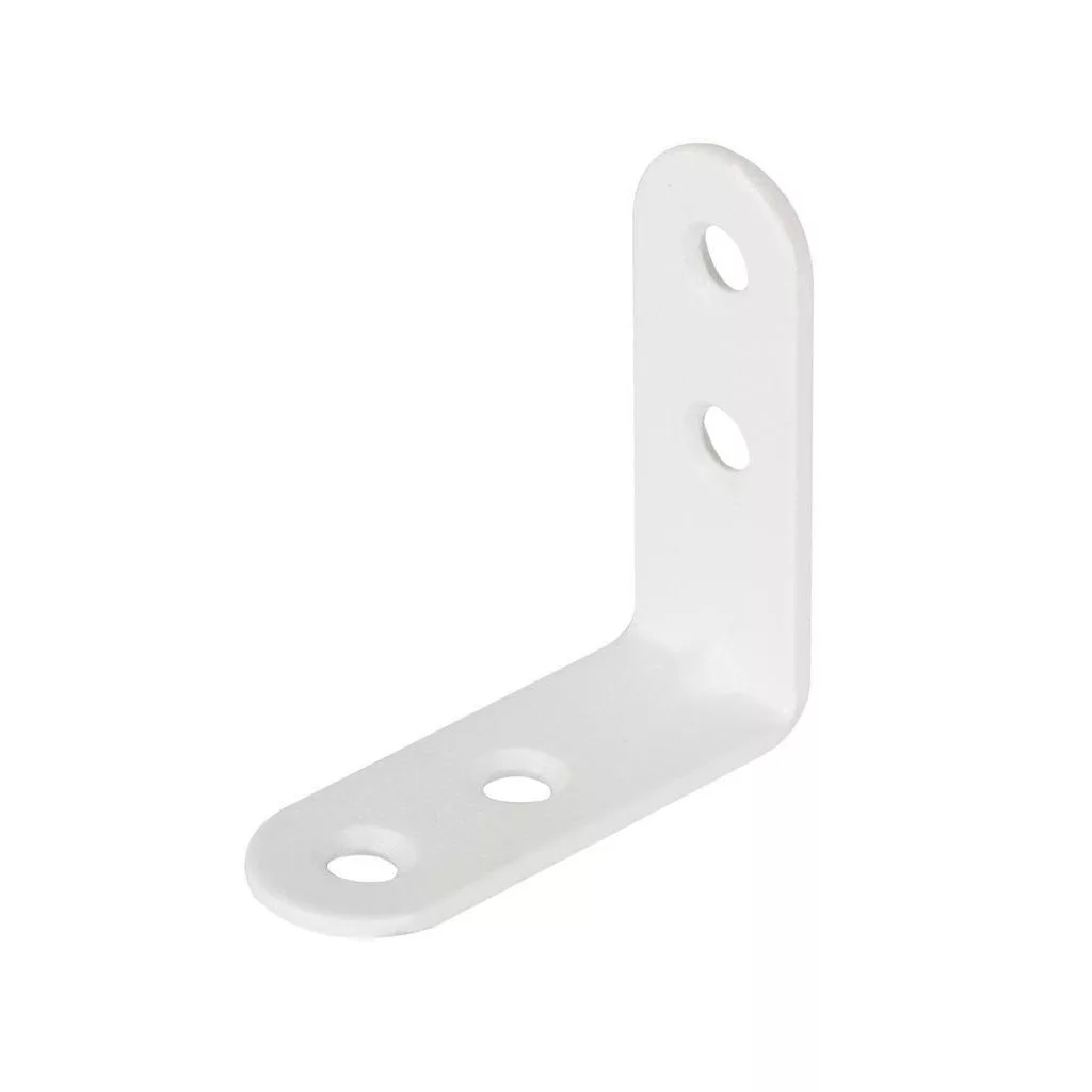 Fehér acél összekötő szögidom, 15 mm széles és 40 mm magas, süllyesztett rögzítőfuratokkal.