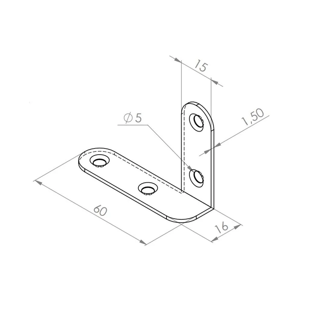 Jobb oldali horganyzott összekötő szögidom, 16 mm széles és 45 mm magas, süllyesztett rögzítőfuratokkal.