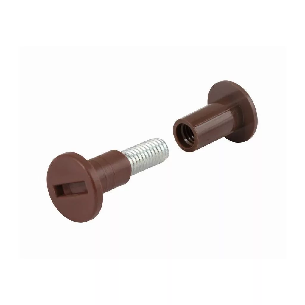 Bútorösszekötő csavar M6 acélmenettel, 26-36 mm magas, 16 mm átmérőjű műanyag fejjel és 15 mm magas műanyag kupakkal, barna színben. Laposfejű csavarhúzóhoz való nyílással. A csomag 4 db-ot tartalmaz.