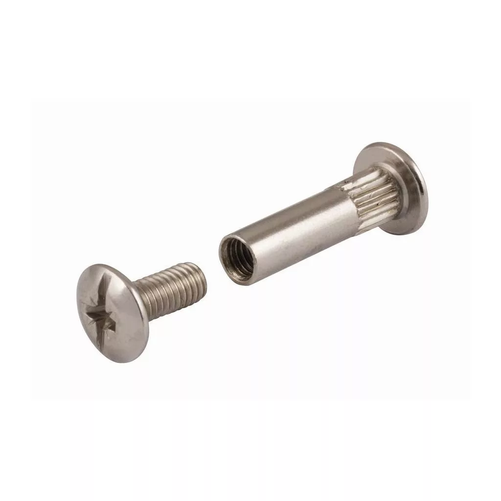 Nikkelezett bútorösszekötő csavar M6 acélmenettel, 29-40 mm magas, 14 mm átmérőjű fejjel és 32,4 mm magas kupakkal. A csomag 8 db-ot tartalmaz.