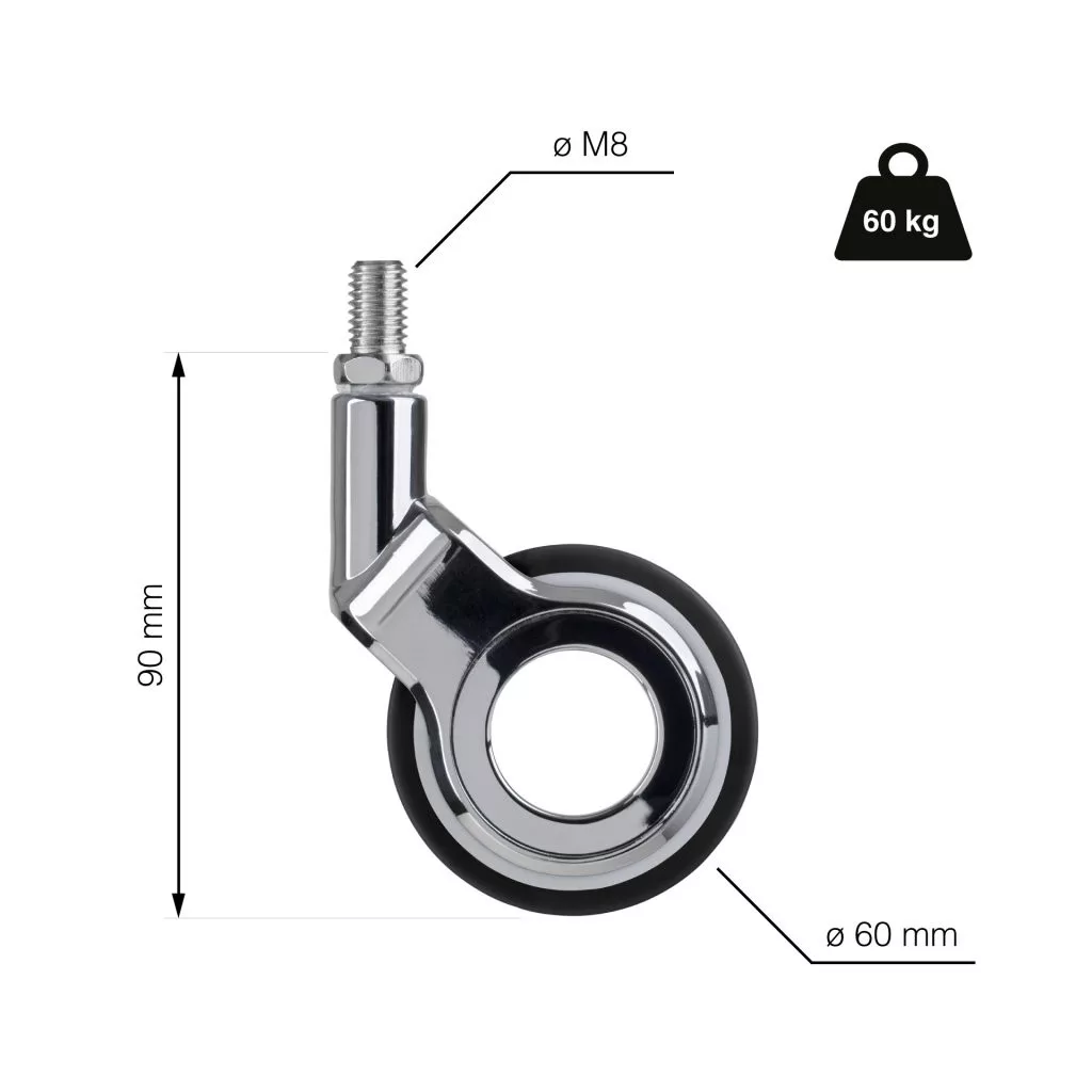 60 mm átmérőjű, M8-as menettel és akár 60 kg dinamikus teherbírással rendelkező, bútorokra szerelhető dizájn bútorkerék.