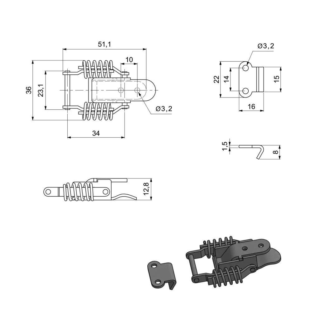 Horganyzott dobozzár húzórugóval, 65 mm széles és 36 mm mély, dobozok/ládák fedeleinek lezárására, nyílások rögzítésére alkalmas.