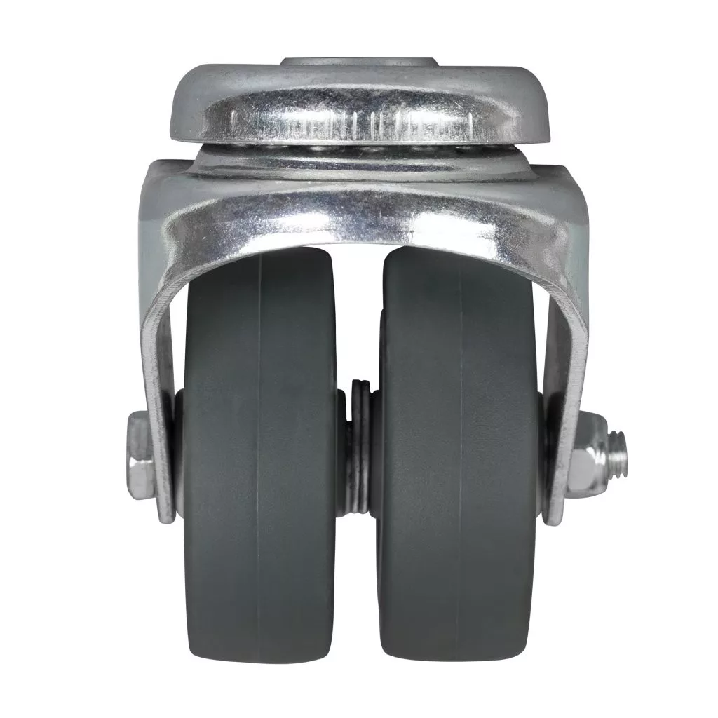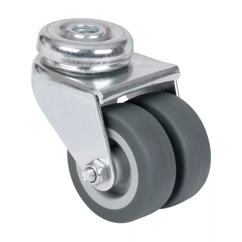 Forgatható, dupla szerkezeti kerék, 50 mm átmérőjű, lyukkal. Teherbírás akár 70 kg.