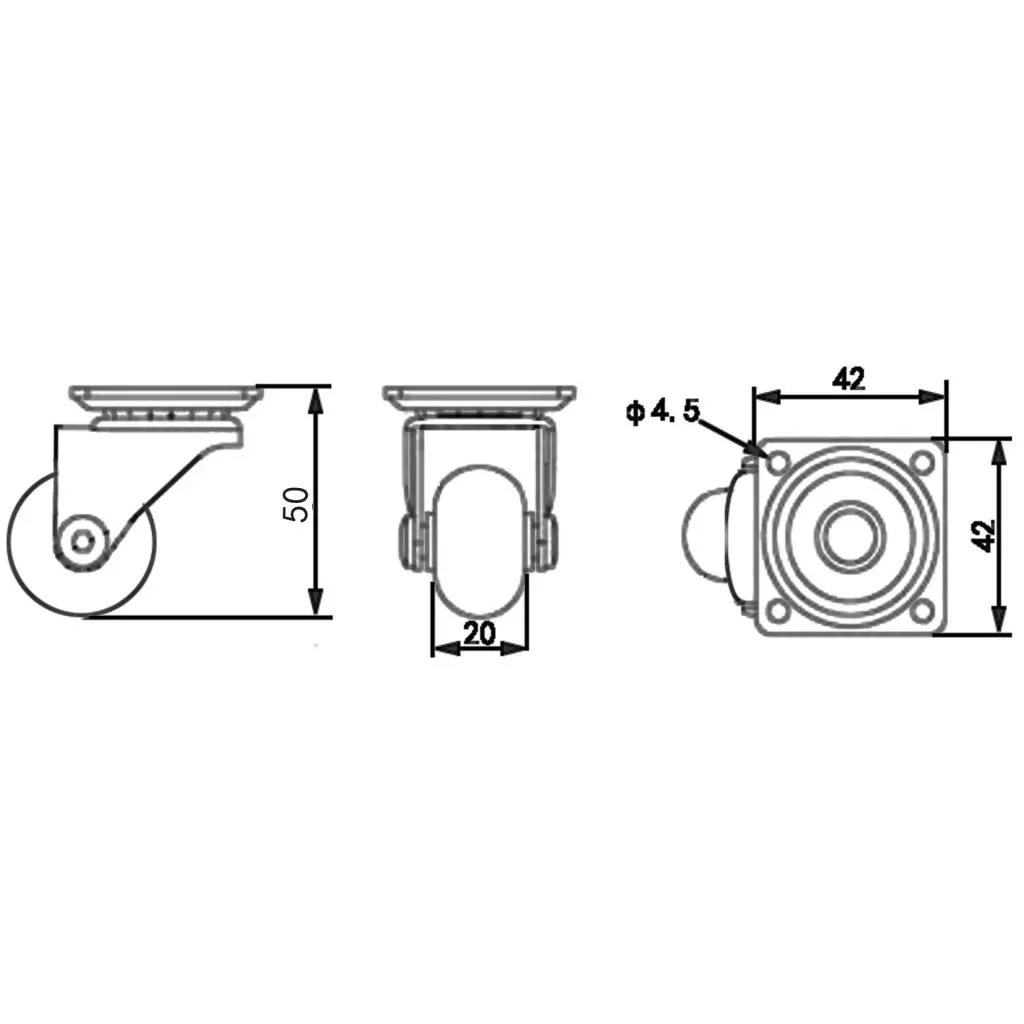 35 mm átmérőjű, 30 kg dinamikus teherbírású forgógörgő. A görgő teljes szerkezeti magassága 50 mm, 42 x 42 mm-es talppal. Puha padlóra tervezve.