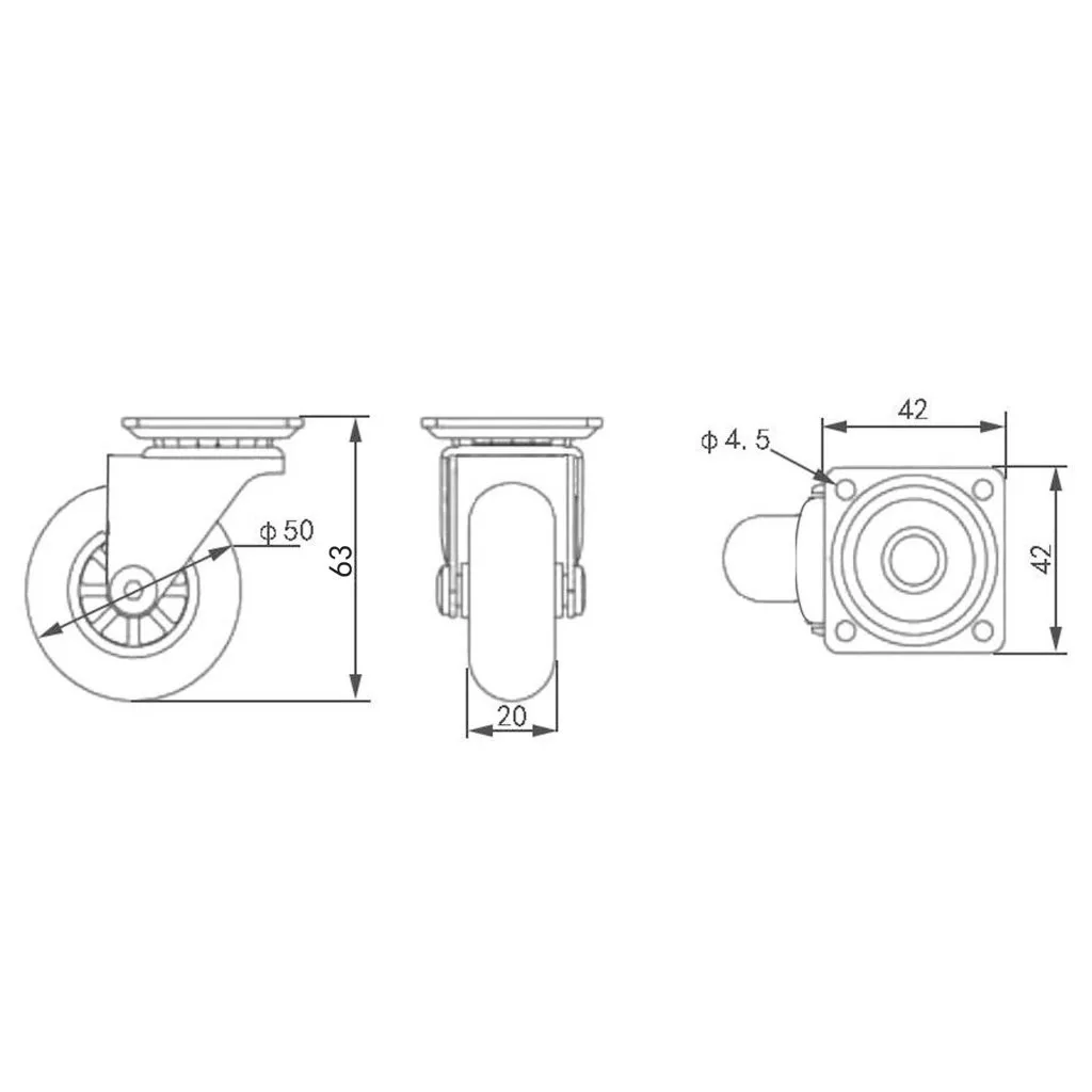 50 mm átmérőjű, 40 kg dinamikus teherbírású forgógörgő. Görgőmagasság 63 mm, 42 x 42 mm-es talppal. Puha padlóra tervezve.