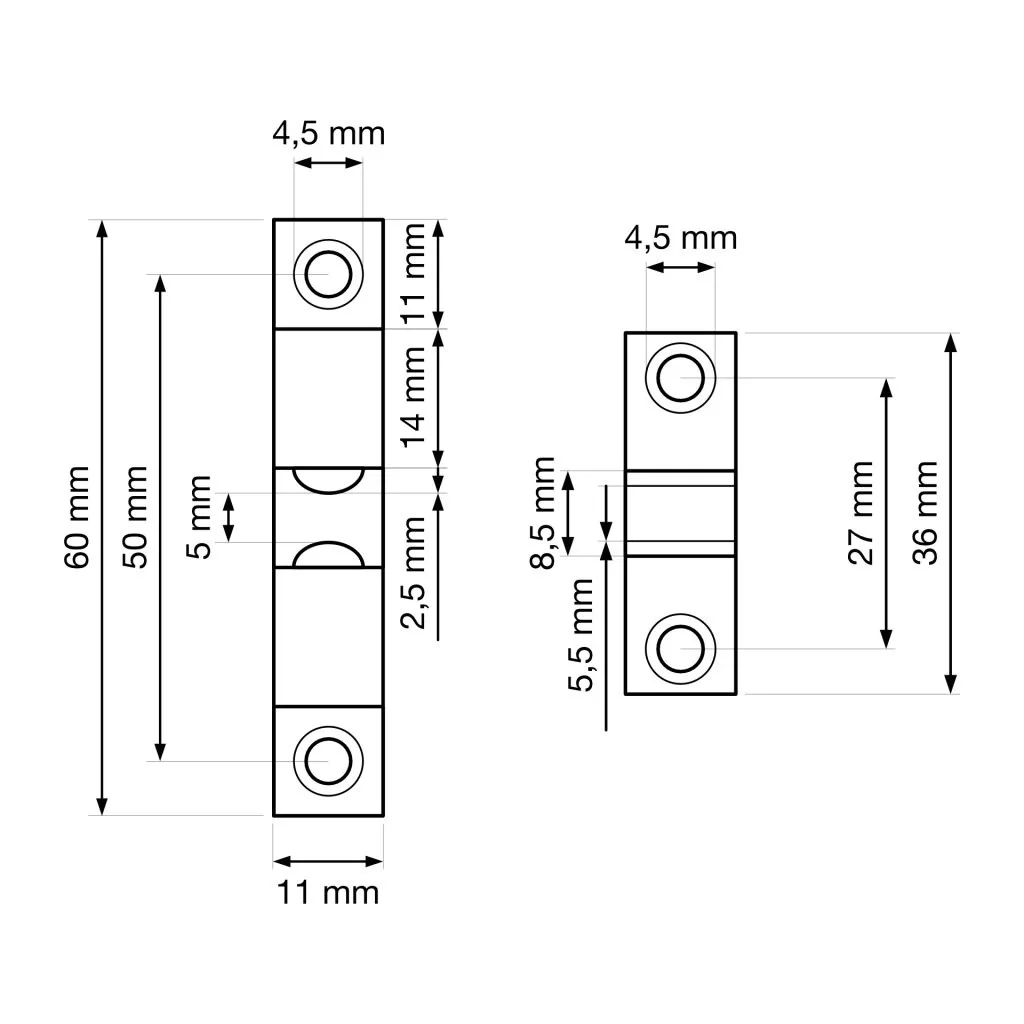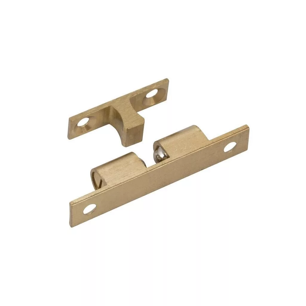 60 mm magas sárgaréz dupla golyós retesz. Csavaros rögzítés. A golyók ereje és ütközése laposfejű csavarhúzóval állítható. Alkalmas ajtók kinyílás elleni biztosítására.