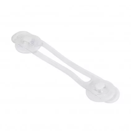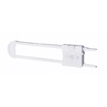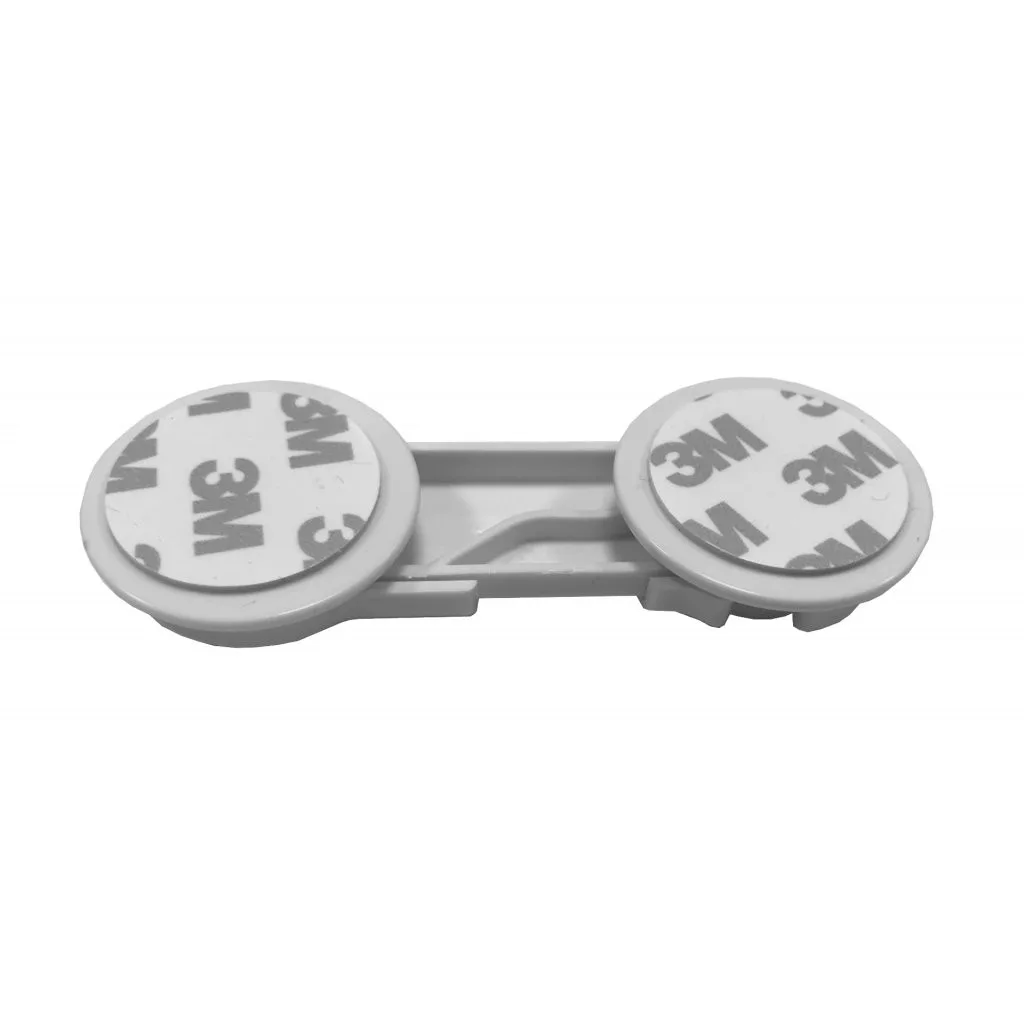 Öntapadós biztonsági retesz 100 mm hosszú ajtókhoz és fiókokhoz, fehér színben. Egyszerű.