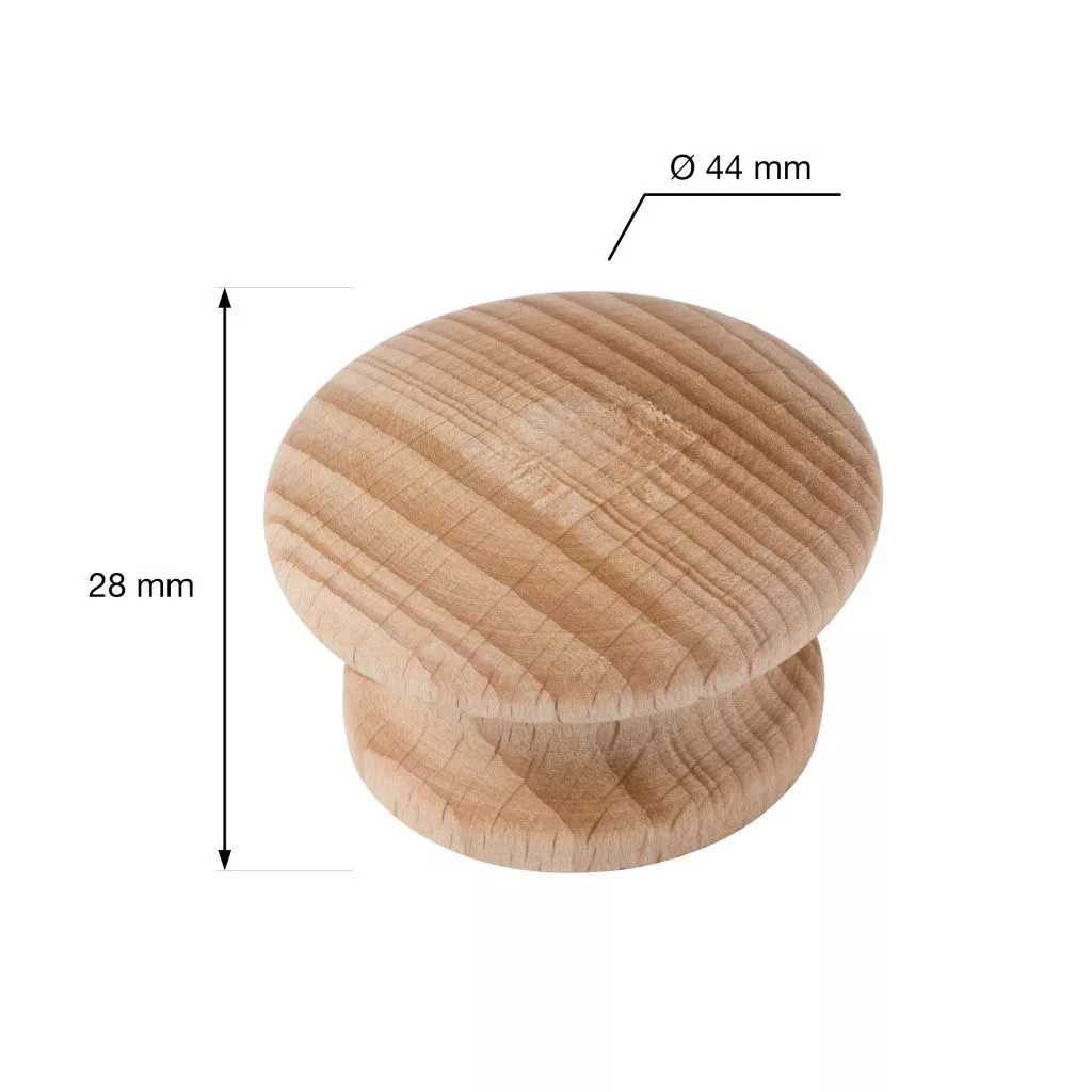 Humberto fa bútorgomb natúr bükkfából, 44 mm átmérőjű és 28 mm magas. A csomag tartalmaz egy rögzítőcsavart.