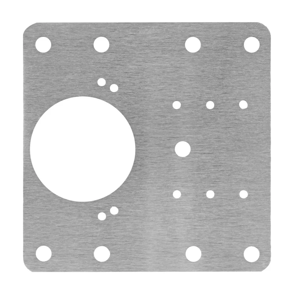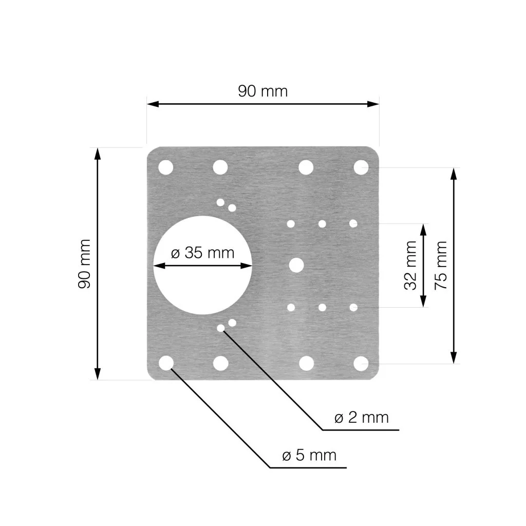 90x90 mm méretű rozsdamentes acél javítólemez 35 mm átmérőjű pántpánthoz.