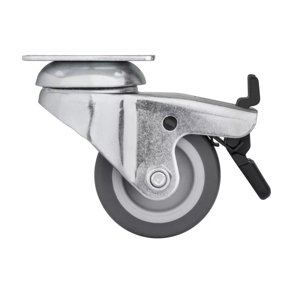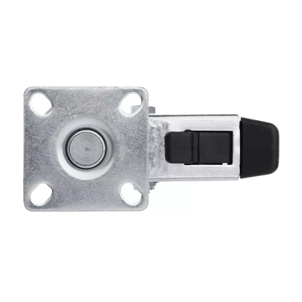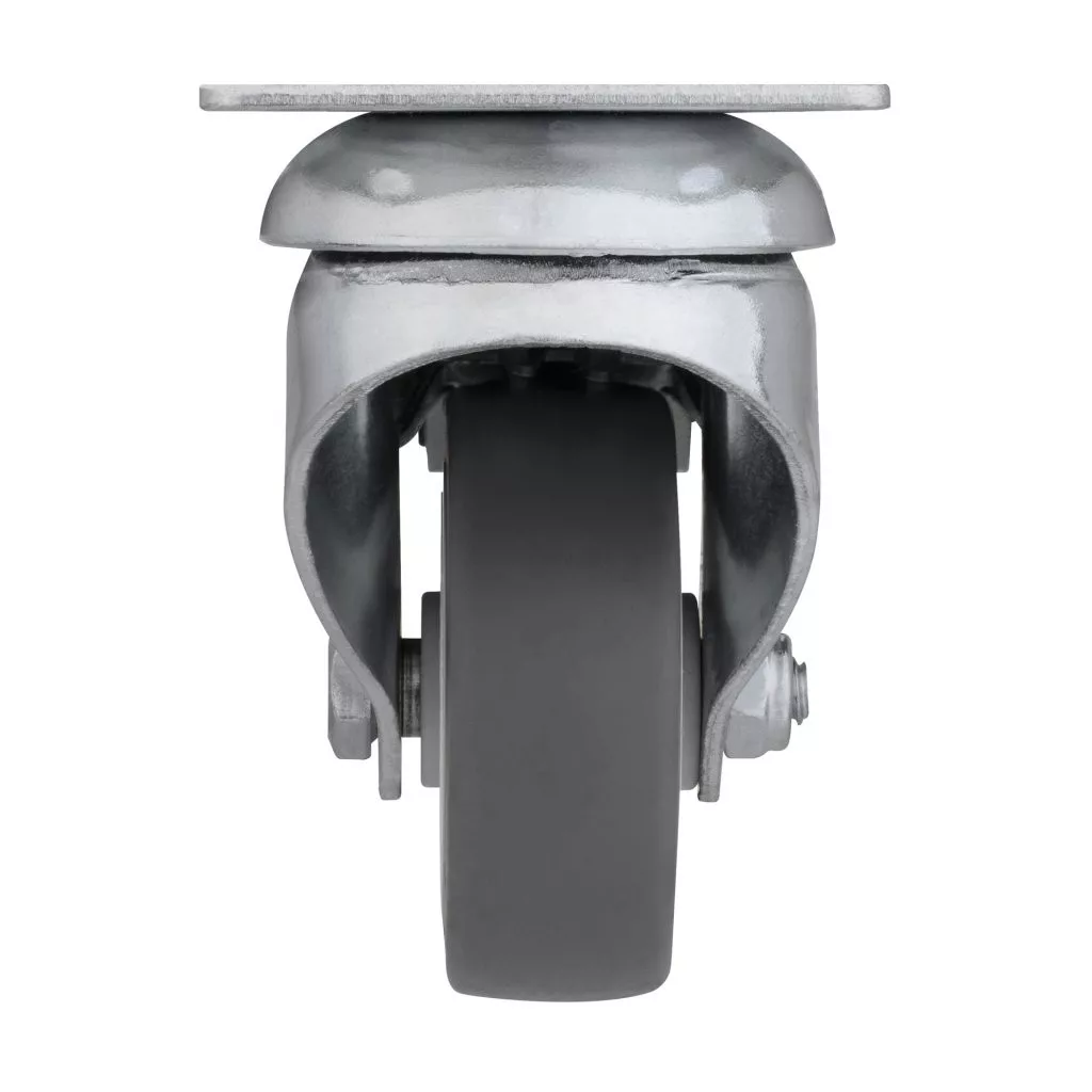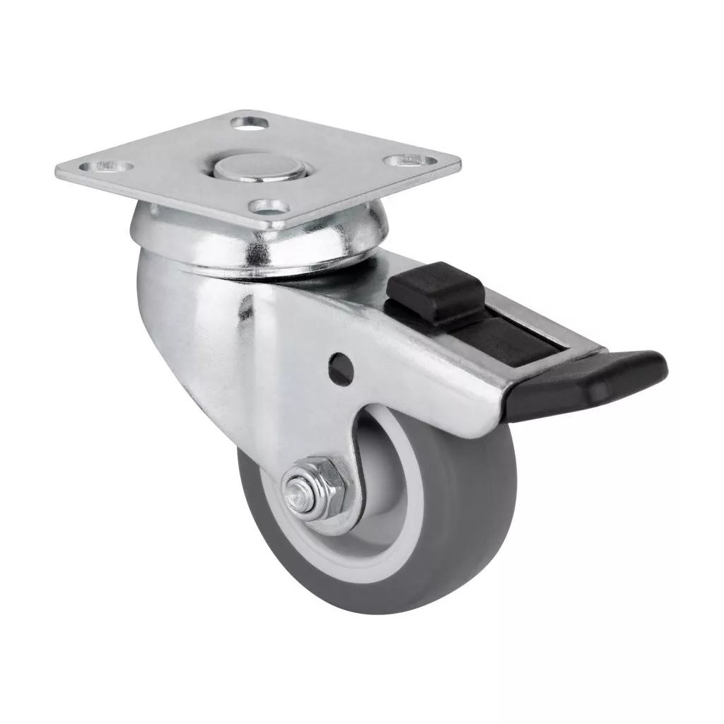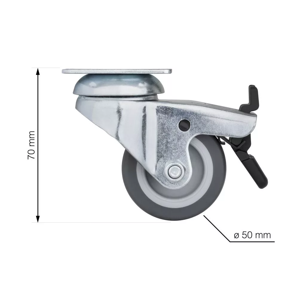 Fékezhető forgógörgő, átmérője 50 mm, dinamikus teherbírása 40 kg. Görgőmagasság 70 mm, talpmérete 60 x 60 mm. Kemény padlóra tervezve.