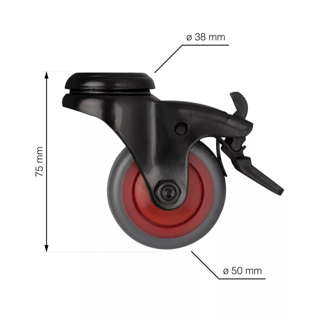Fékezhető forgógörgő, átmérője 50 mm, dinamikus teherbírása 50 kg. A görgő teljes magassága 75 mm, lyukátmérője 38 mm. U
