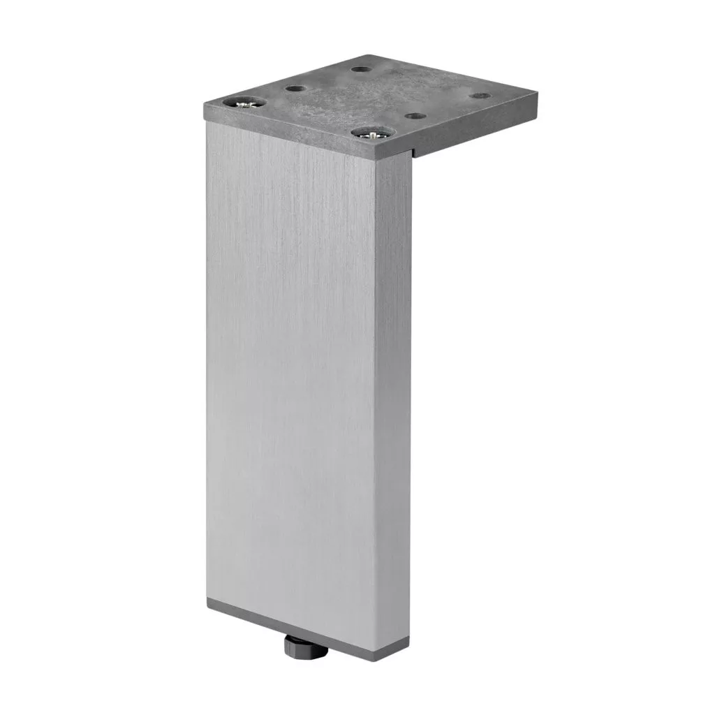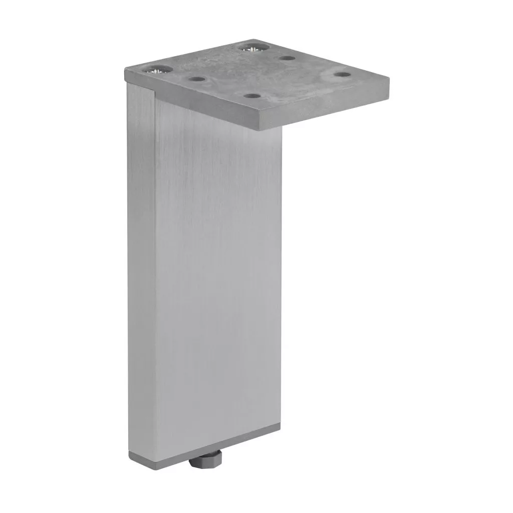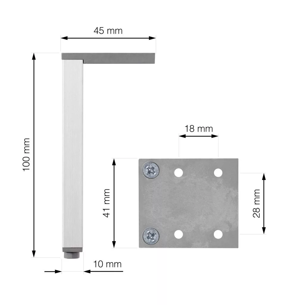 Minimalista bútorláb eloxált alumíniumból, 10/45 mm szélességgel, 100 mm magassággal és 41 mm mélységgel, műanyag csúszkával. A 45 x 41 mm méretű talp biztosítja a bútor szilárd rögzítését.